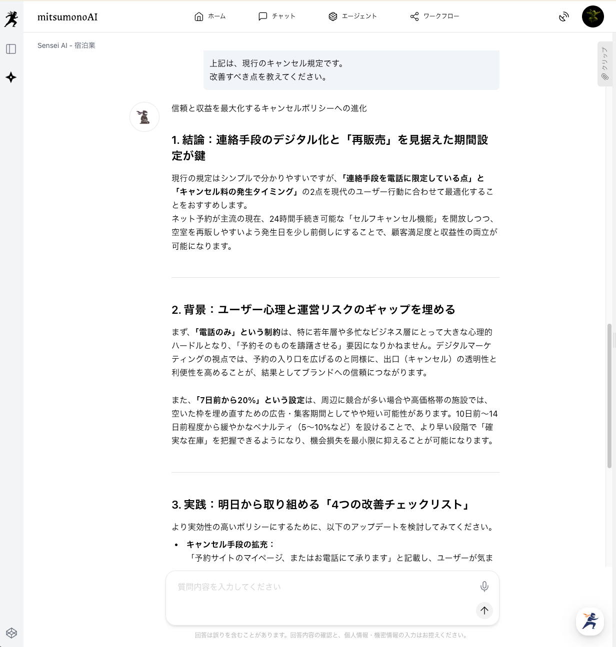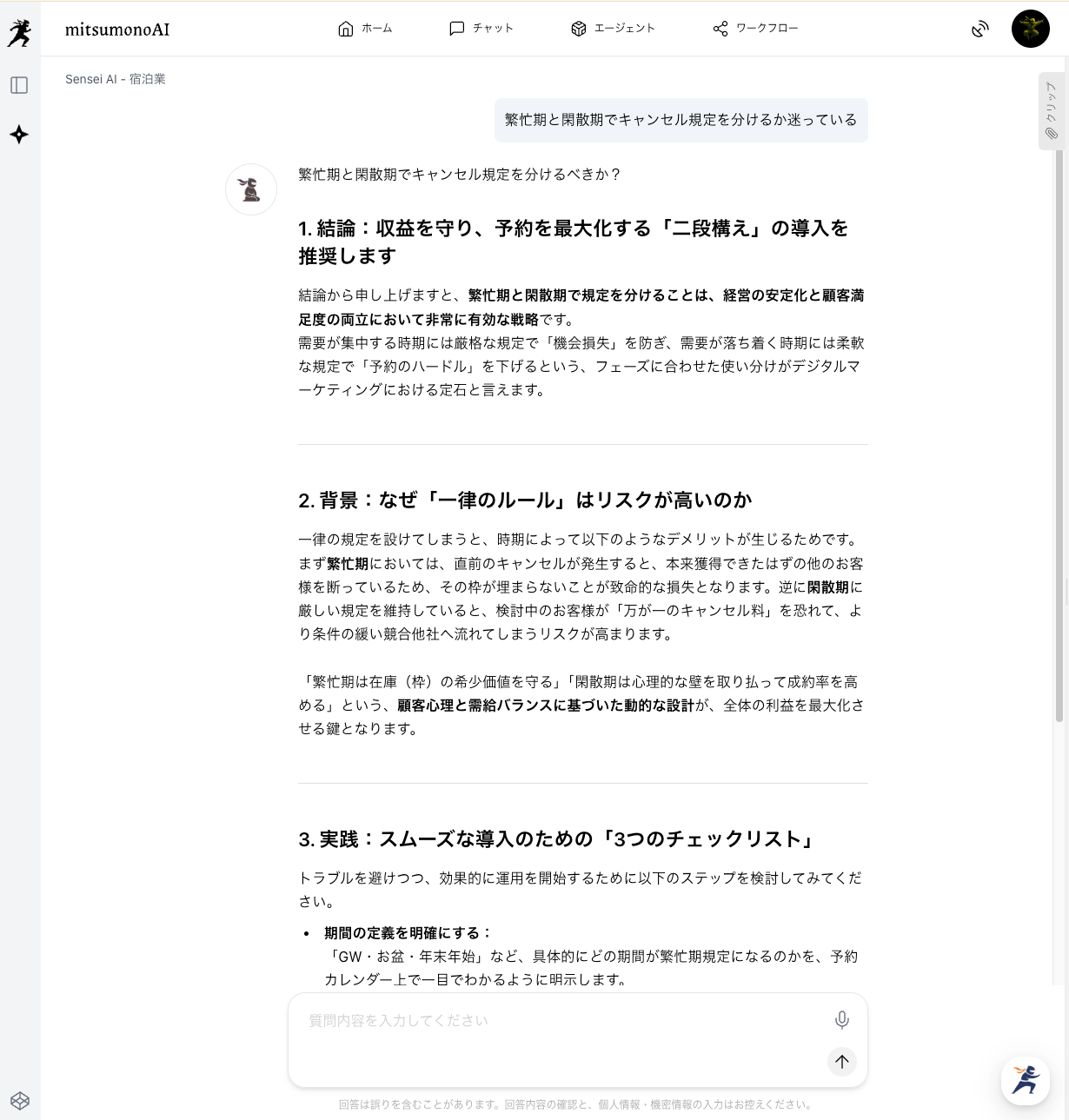 Sensei AIは、宿泊業・飲食業・小売業など、各業種に特化したAIコンサルタントです。戦略立案・商品企画・顧客分析など、日常業務を効率化しながら判断の質を高めるための活用方法を、mitsumonoAIでご紹介しています。