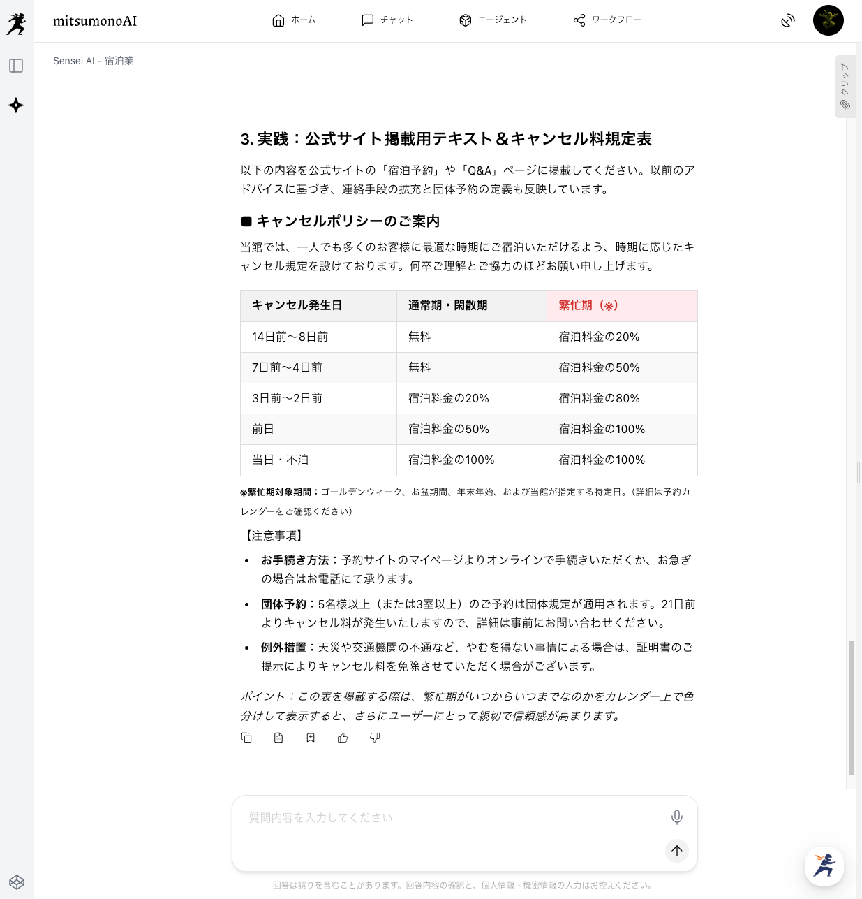 最後に、AIが提案した改善案をもとに、繁閑期別の規定表とお客様向け文章を作成します。