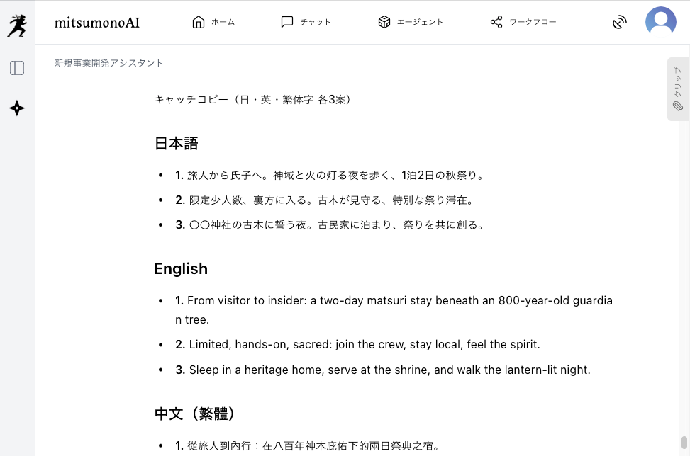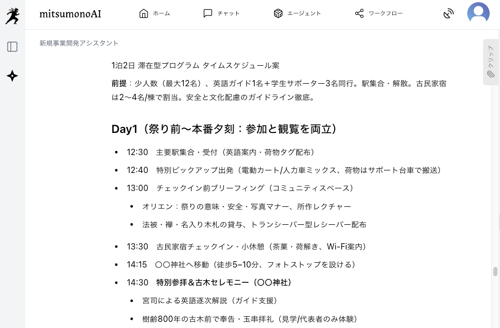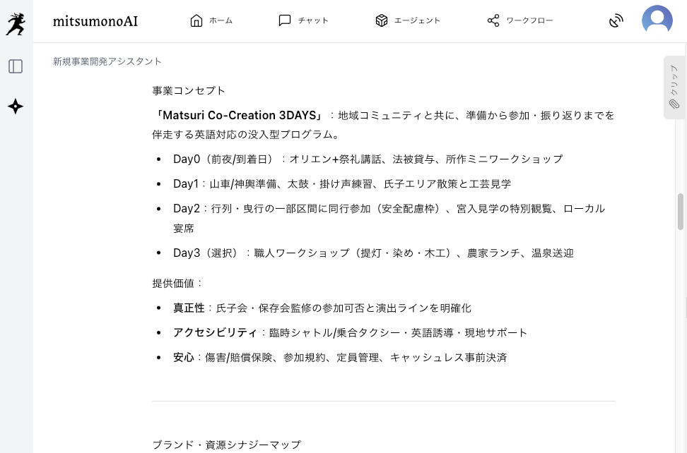 ここからは、地方の「秋祭り」を例に、「新規事業開発アシスタント」を活用して外国人観光客向けの体験プログラムを企画する手順を解説します。
