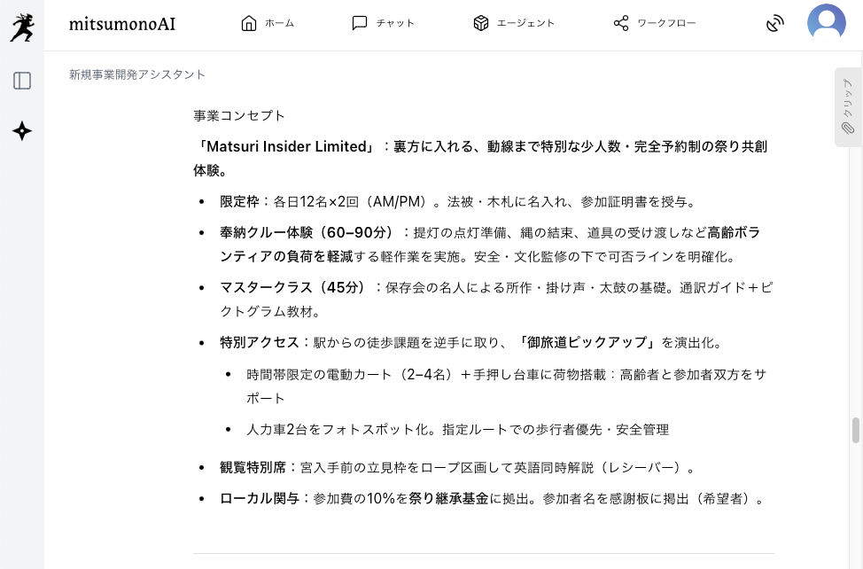 AIは入力情報に基づき、「少人数・没入型『祭り共創プログラム』」といった初期コンセプトを提案します。