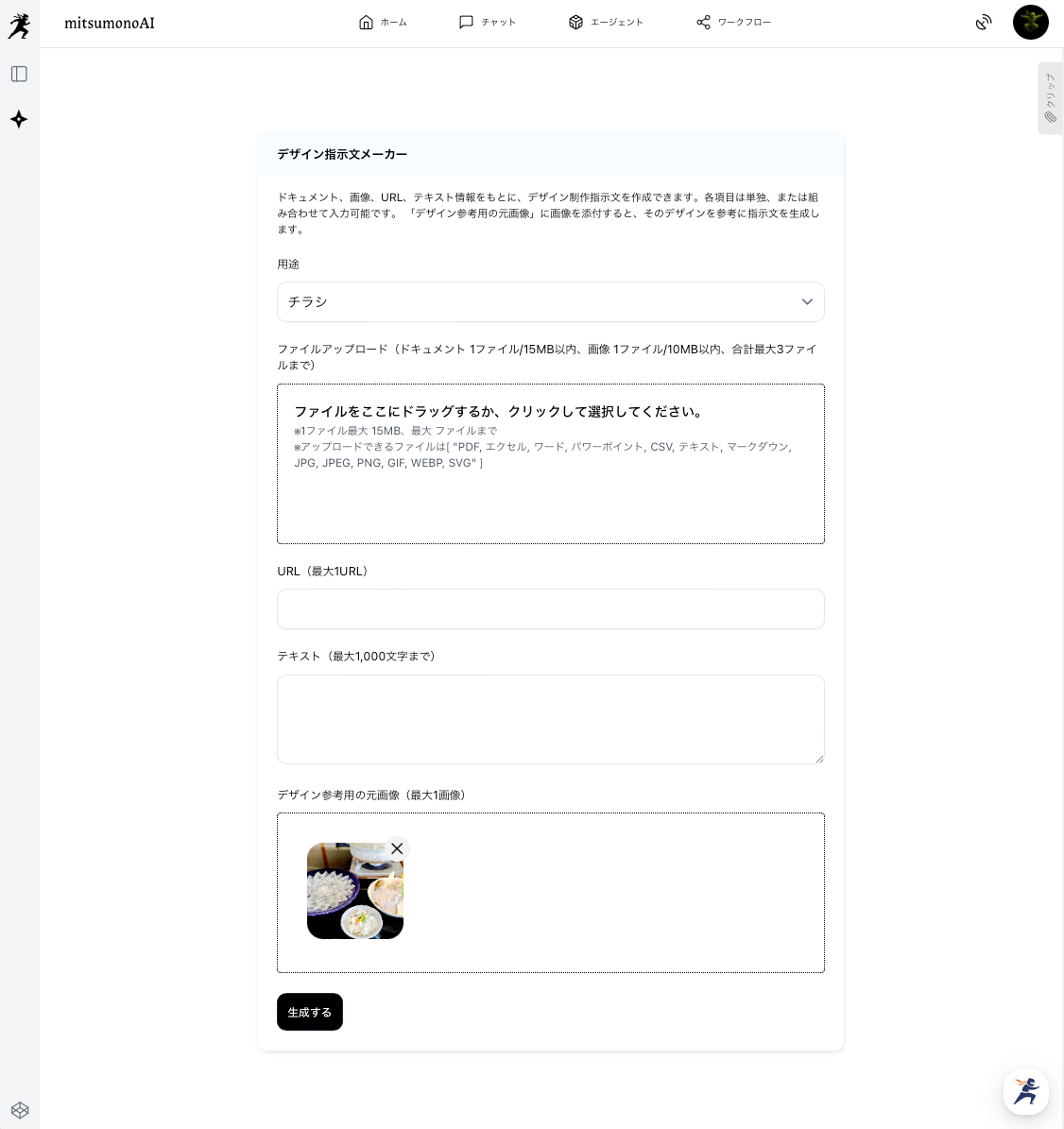 まずは、撮影した写真を「デザイン指示文メーカー」に読み込ませます。AIが写真から料理の特徴や素材感を読み取り、それをどのようにチラシとして構成すべきかという設計図を作成してくれます。