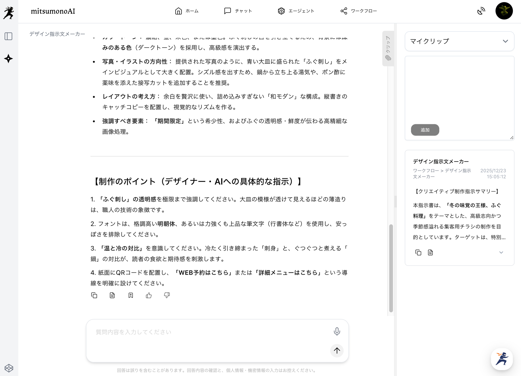 AIは、写真に写った料理の「シズル感」や「温かみ」を言語化し、それを強調するための配色やフォントのイメージを提案します。