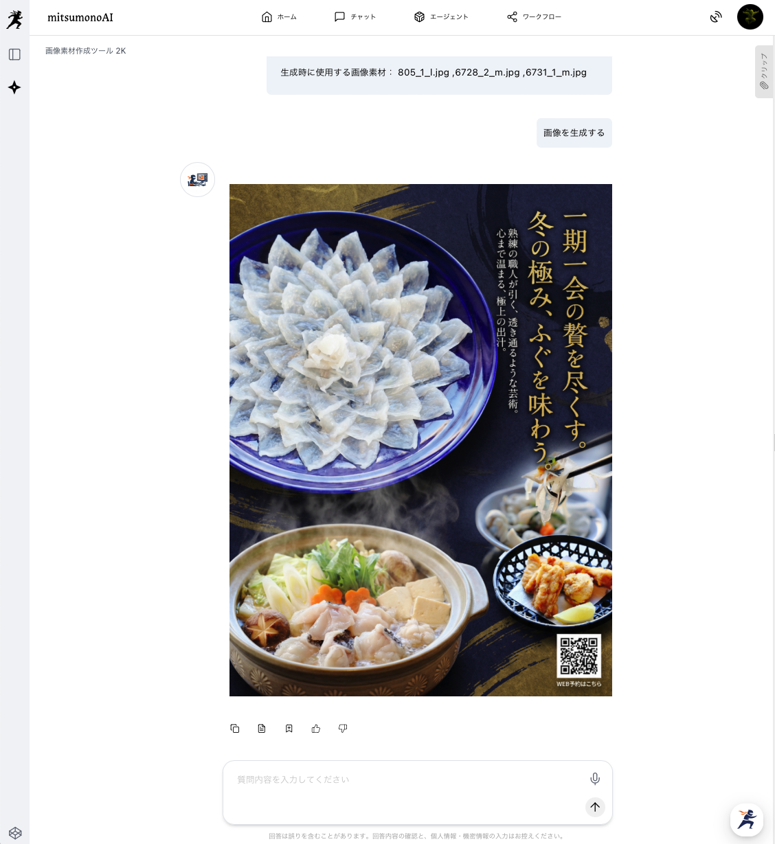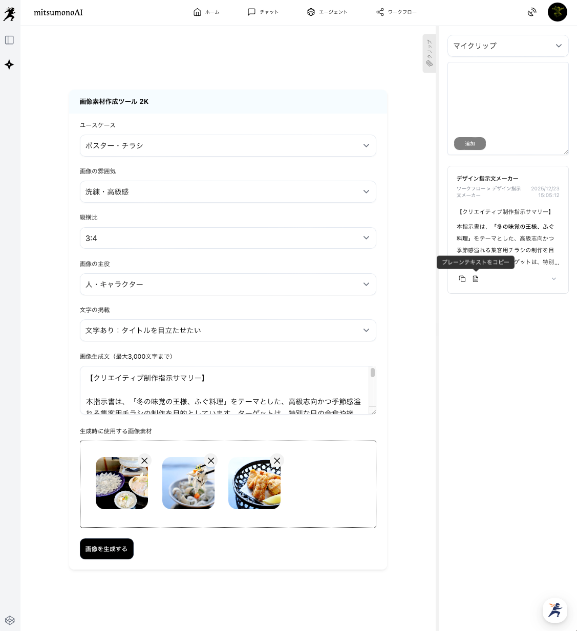 設計図ができたら、次はそれを形にする作業です。「画像素材作成ツール 2K」を使い、先ほどの指示書と元の写真を組み合わせて、チラシのベースとなる高品質な画像を生成します。