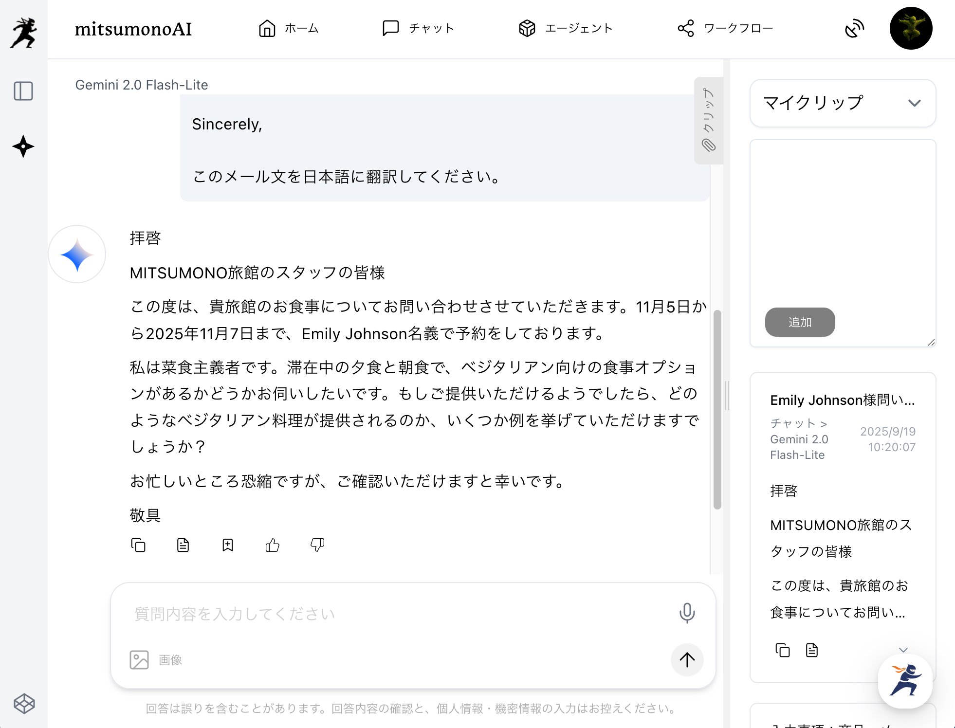固有名詞(「MITSUMONO Ryokan」など)の誤りがないか最終確認を行ったら、このままEmily Johnson様へ送信して対応は完了です。
