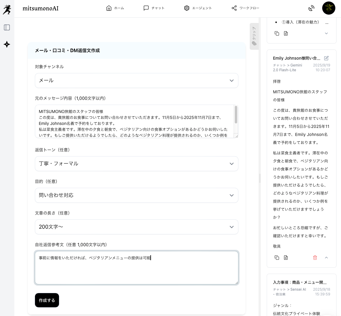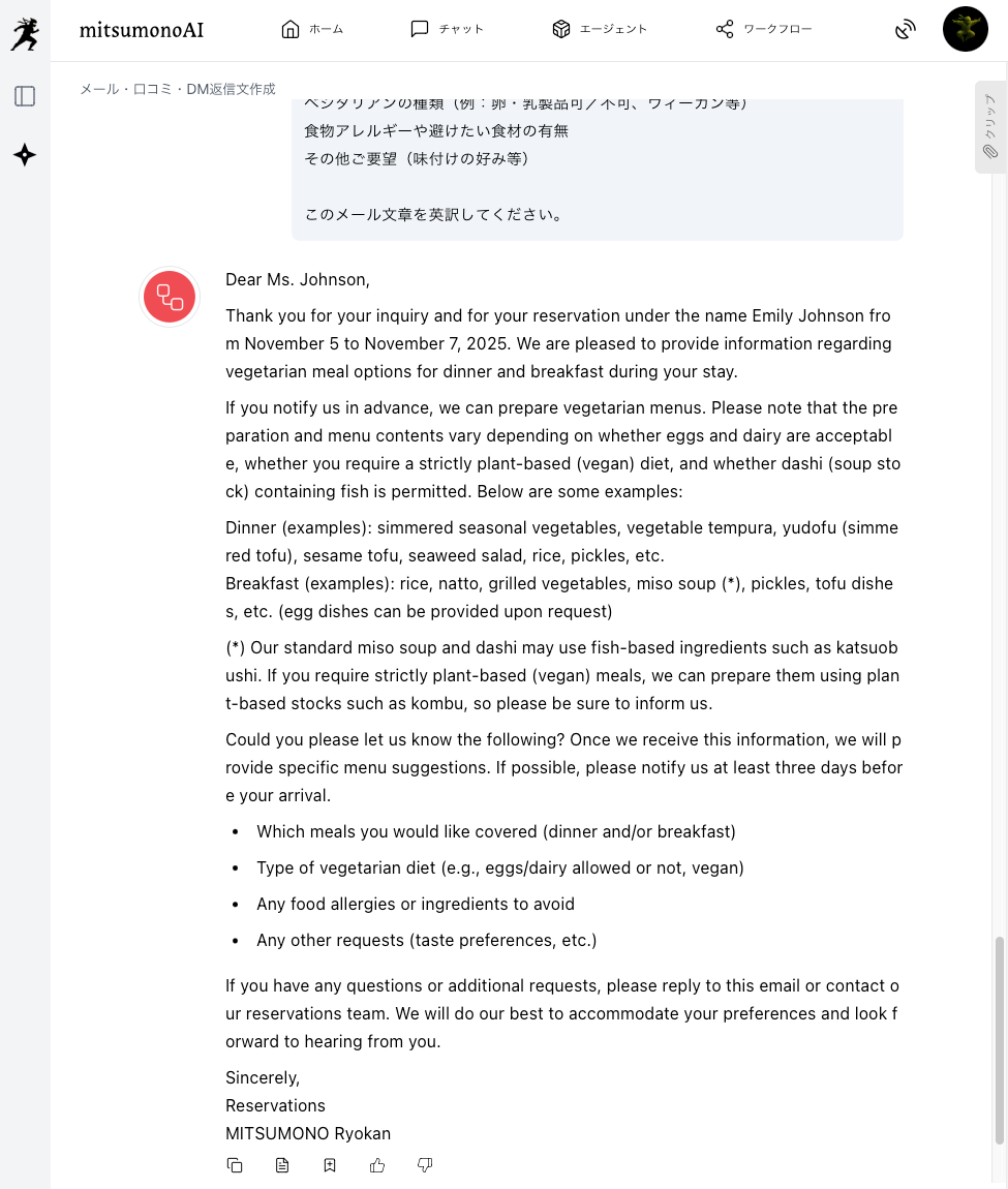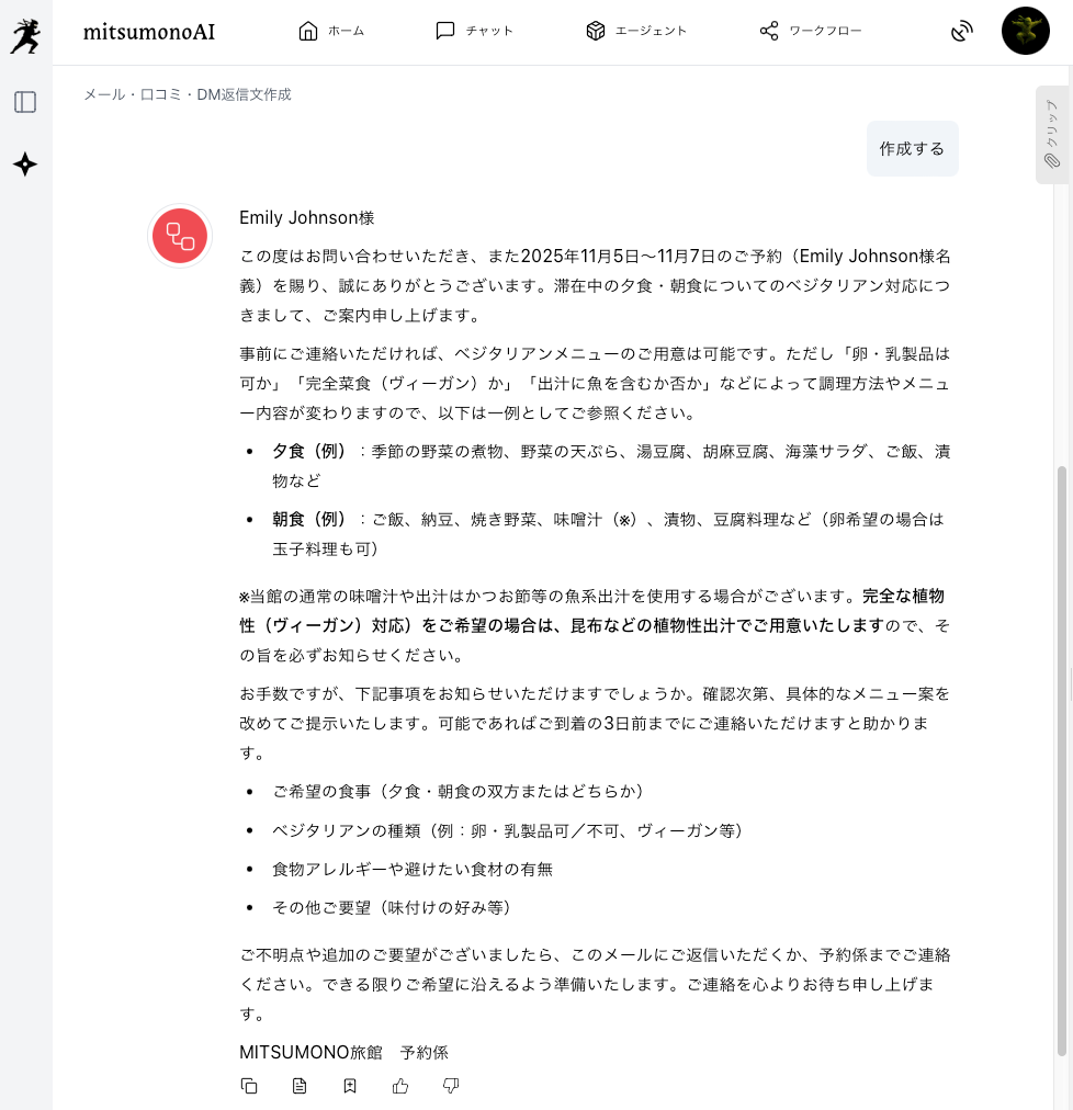 AIは最適な返信文を想定して出力しますが、旅館の実際の対応可否や、提供する料理の具体的な内容など、実情に応じて修正が必要です。