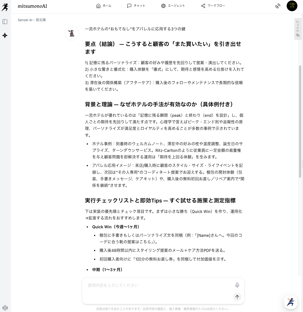 このステップにより、AIはホテル業界の常識である「パーソナルなウェルカムアメニティ」「コンシェルジュによる滞在プランの個別提案」「記念日サプライズの演出」といった、アパレル業界の常識の外にあるアイデアを提示してくれます。