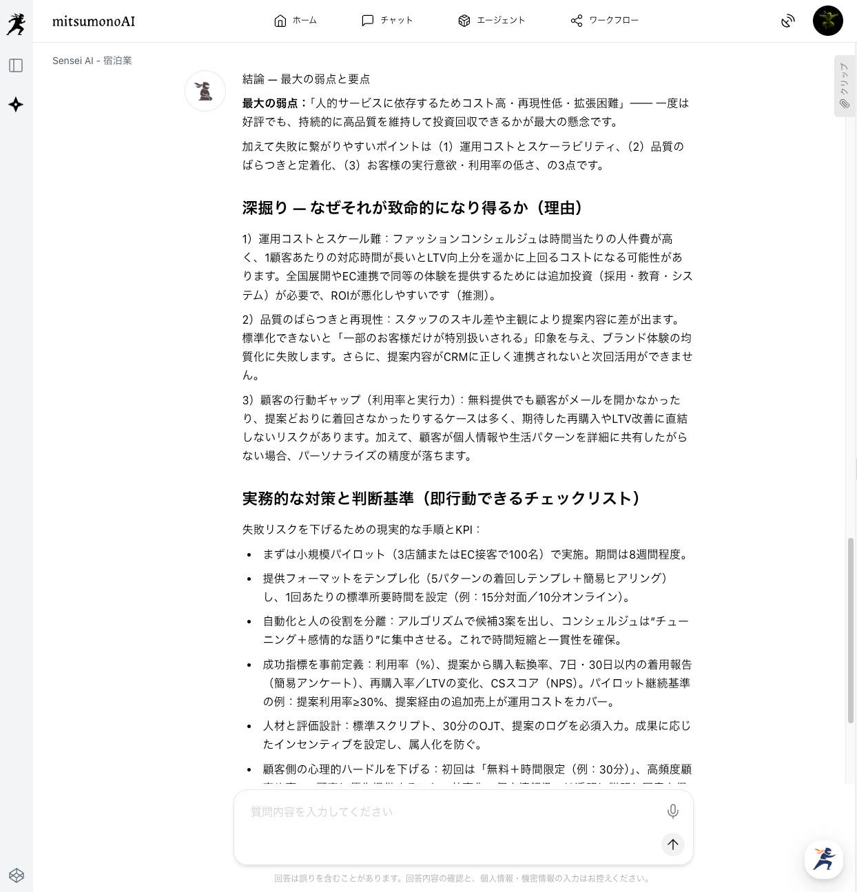 あなたは、非常に厳しい視点を持つ経営コンサルタントです。忖度なく、この企画の「最大の弱点」と「失敗する可能性」を3つ、理由と共に率直に指摘してください。」