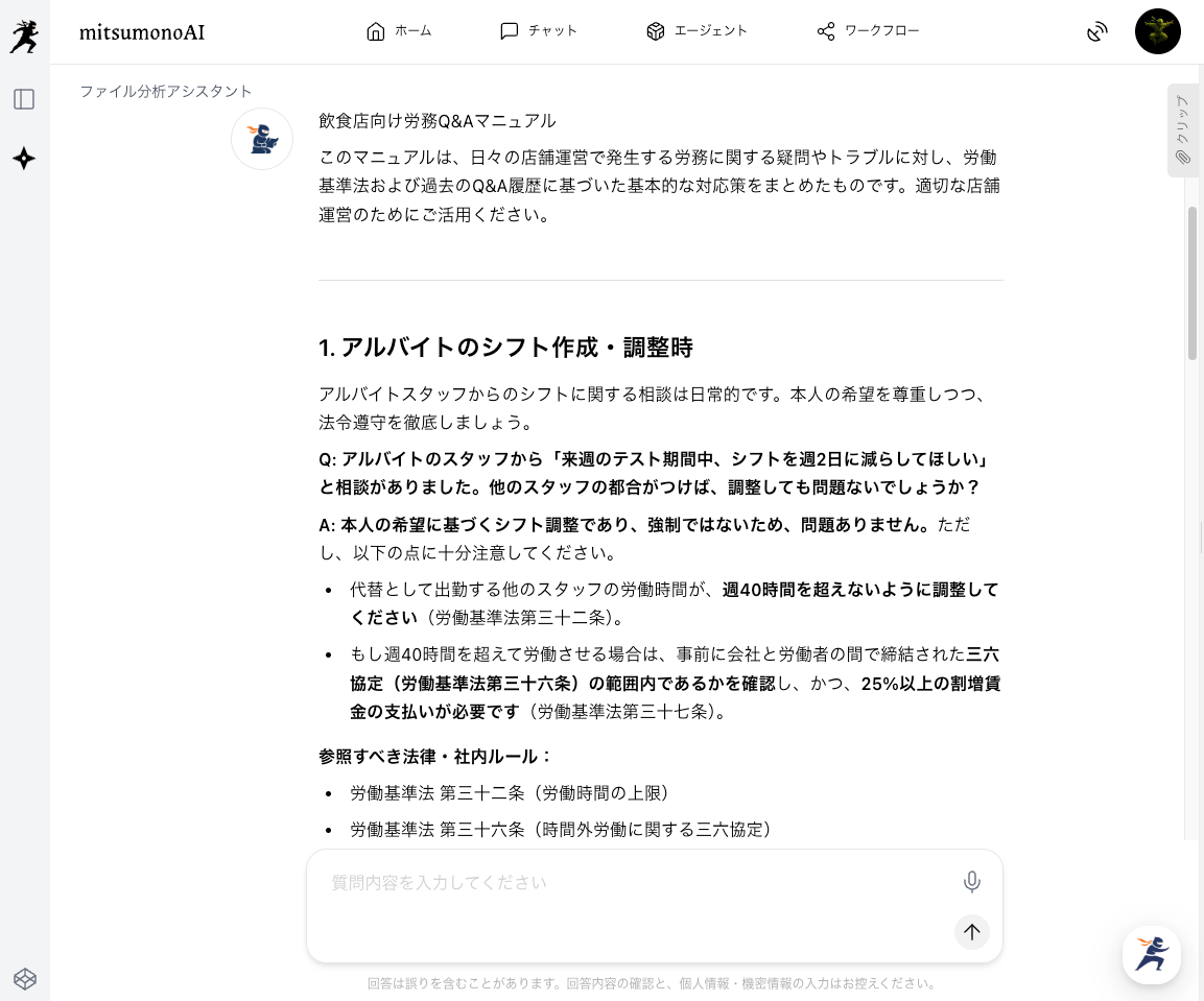 労働基準法などの関連法規の原文PDFと、これまでの社内でのQ&A履歴などをテキストファイルで同時にアップロードします。