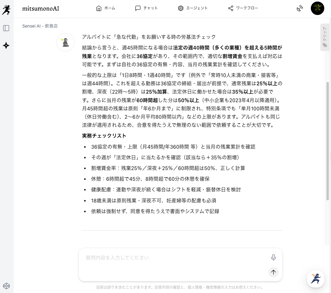 業界特化のSensei AI - 飲食店に、具体的な状況を説明し、法的な問題がないかを問いかけます。