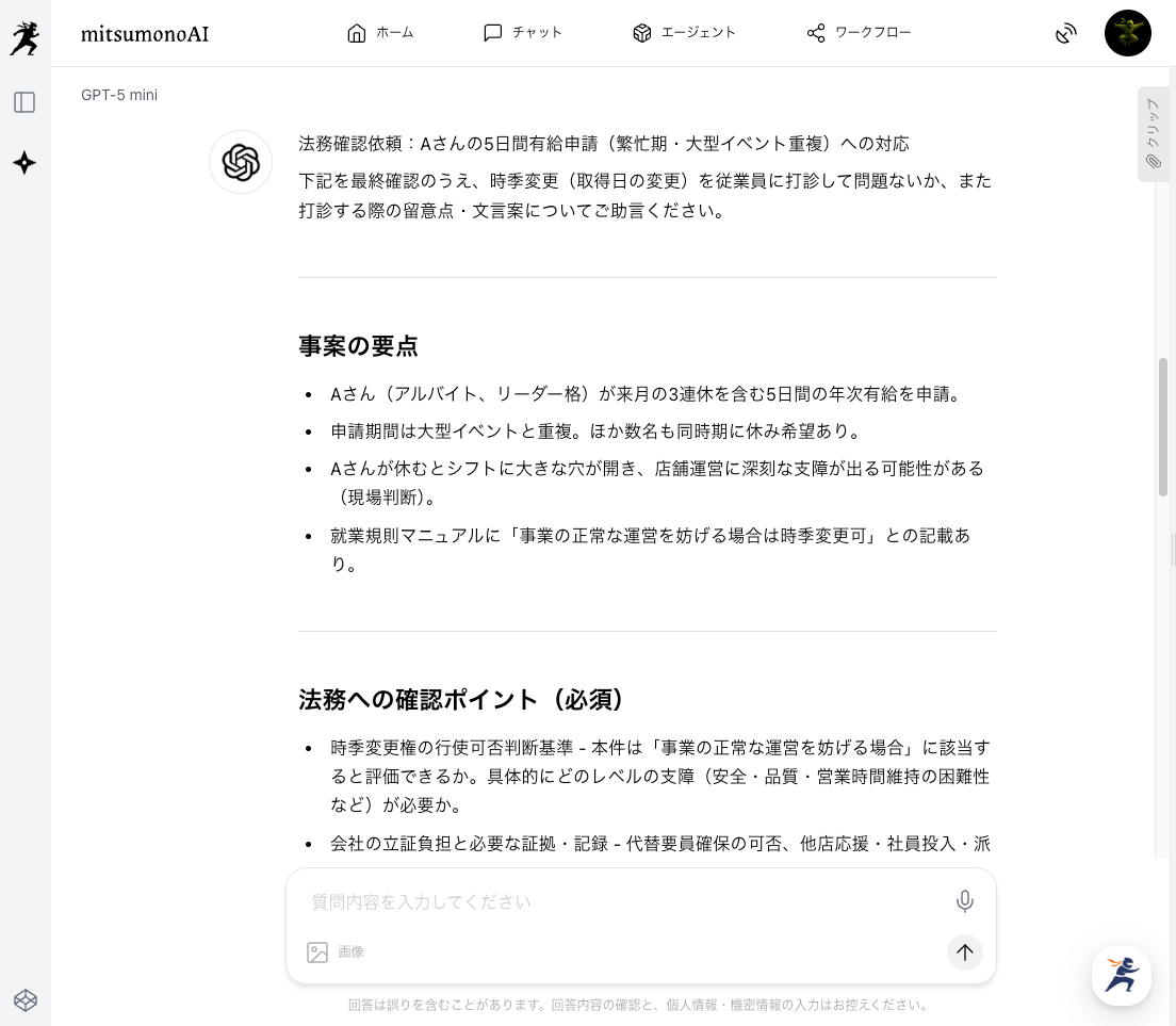 他の従業員は、AIとの対話を通じて法的思考のトレーニングを積むことができ、組織全体のコンプライアンス意識が向上します。 - 業務効率の向上とリスクの低減