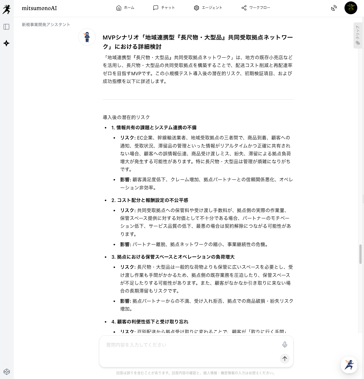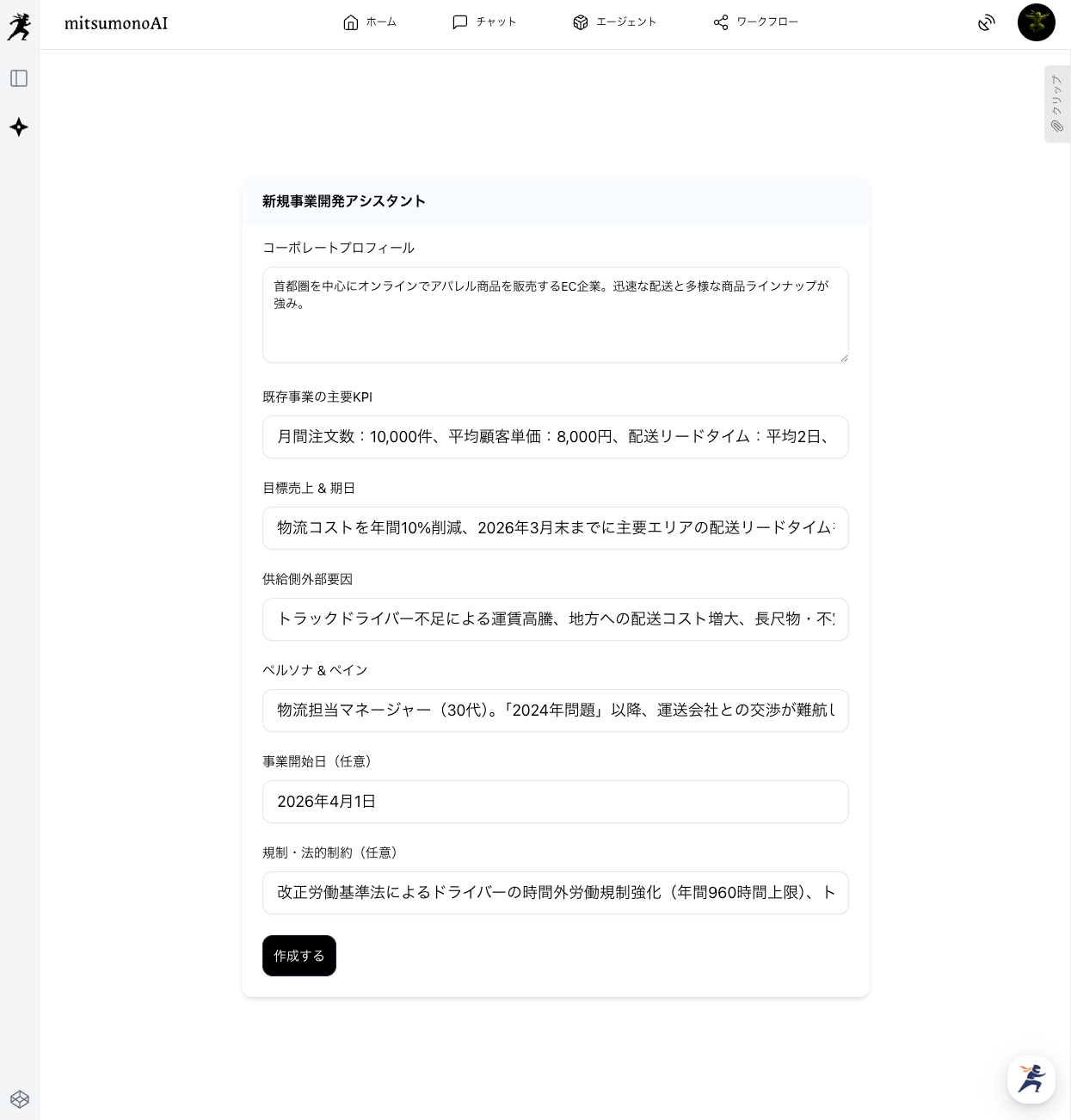 上記のように入力して、新規事業の計画を生成させます。