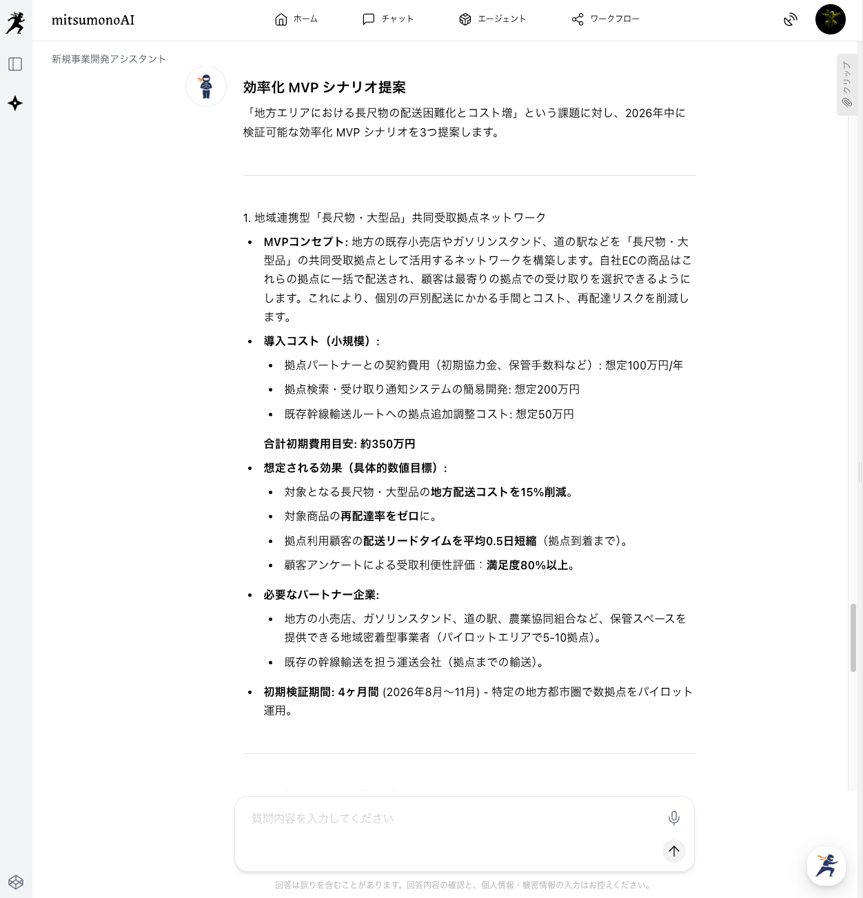 ステップ1で特定した具体的な課題に対し、新規事業開発アシスタントを活用し、最小限の投資で最大効果が見込める「MVP」としての効率化シナリオを考案します。