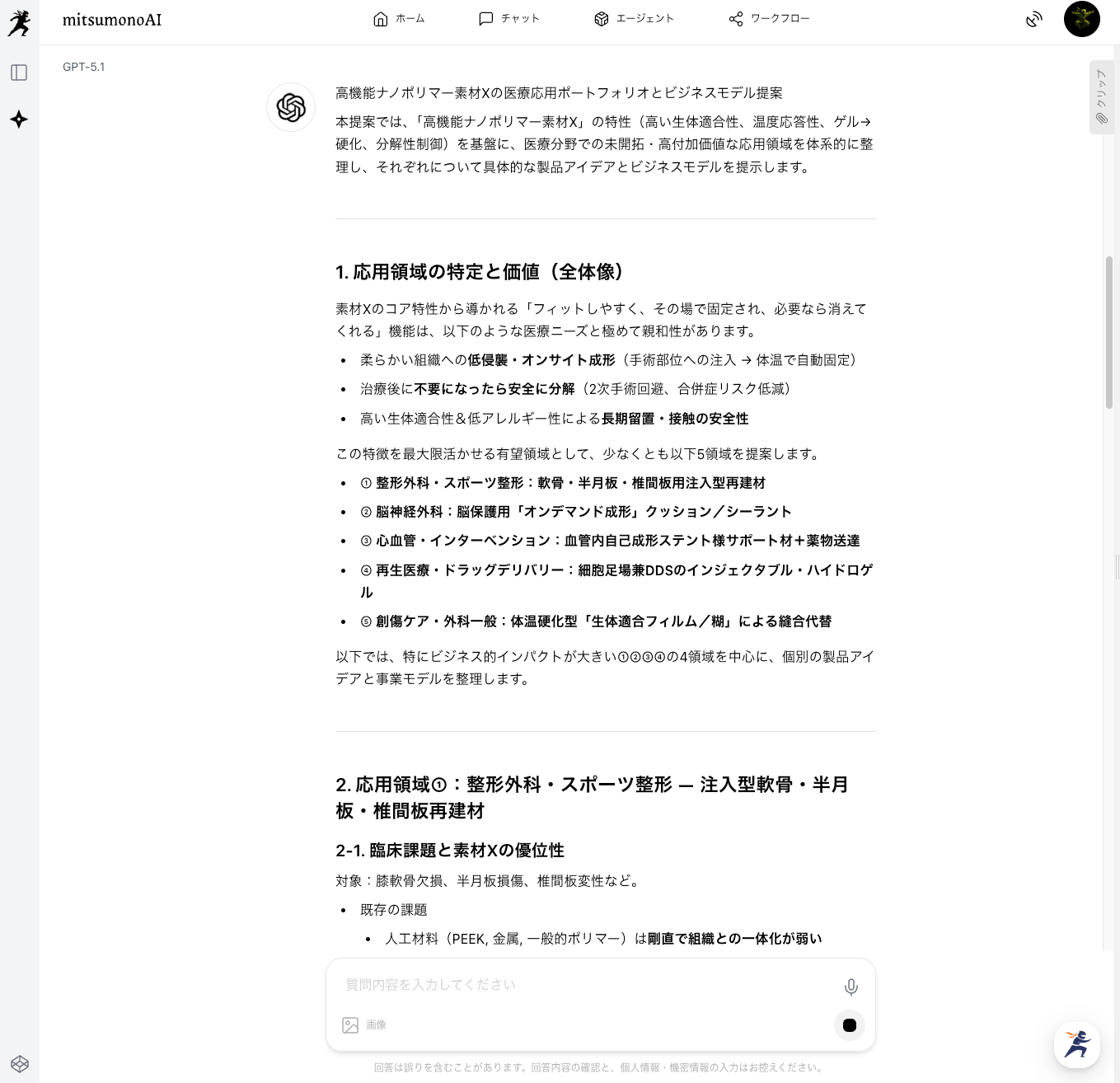 この壁打ちでは、新素材の可能性を最大限に引き出し、医療分野におけるイノベーションと持続可能な事業創出につながる、多角的で実現性の高いアイデアを求めています。長文の指示と複雑な要求を深く理解し、体系的かつ創造的な思考プロセスで分析結果とビジネスモデルを提示してください。」