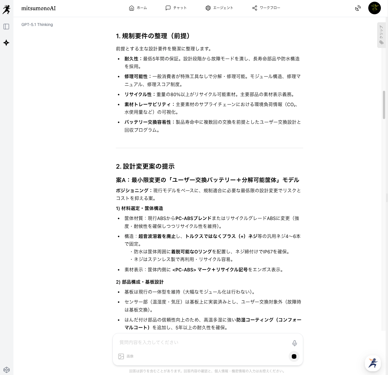 契約書の詳細なリスク評価、大規模な法規制文書からの特定の条項抽出と解釈、監査報告書の深層分析など。 - 製品開発におけるリスク評価と改善提案