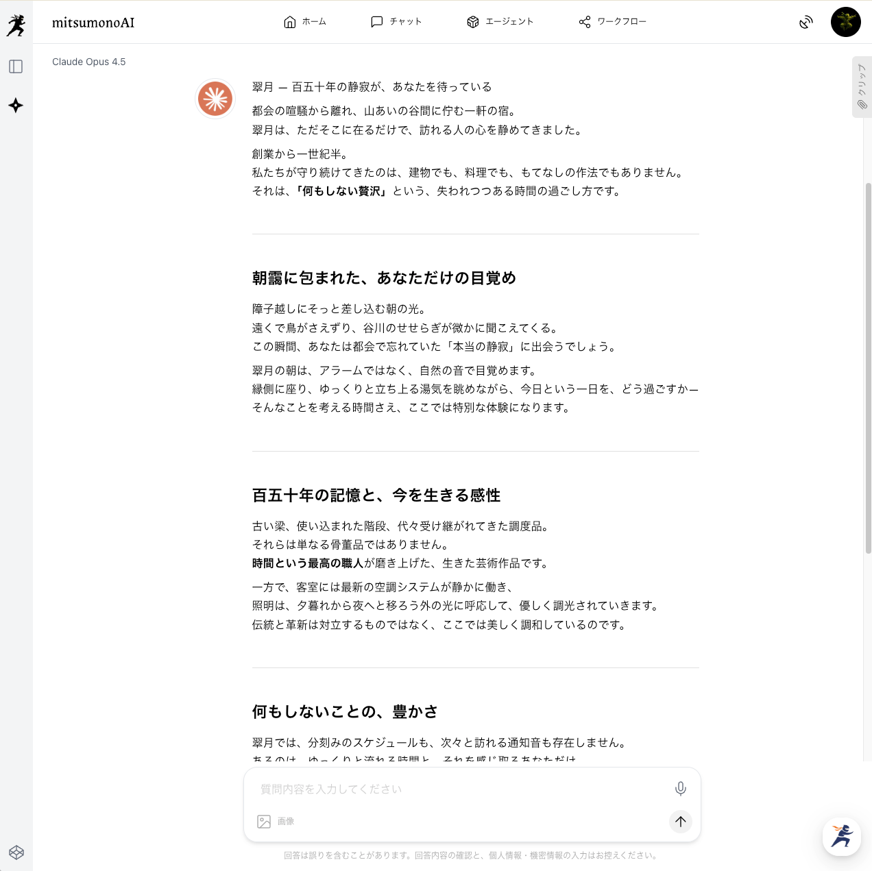 Claude Opus 4.5は、「時間という最高の職人が磨き上げた」といった洗練された比喩表現を用い、老舗旅館の重厚さと現代的な価値観を見事に調和させたブランドストーリーを生成しました。