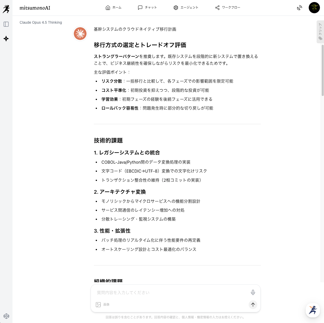 Claude Opus 4.5 Thinkingは、単なるスケジュールの羅列ではなく、まず「ストラングラーパターン」の採用理由をトレードオフ評価とともに提示し、計画の論理的な土台を明確にしました。
