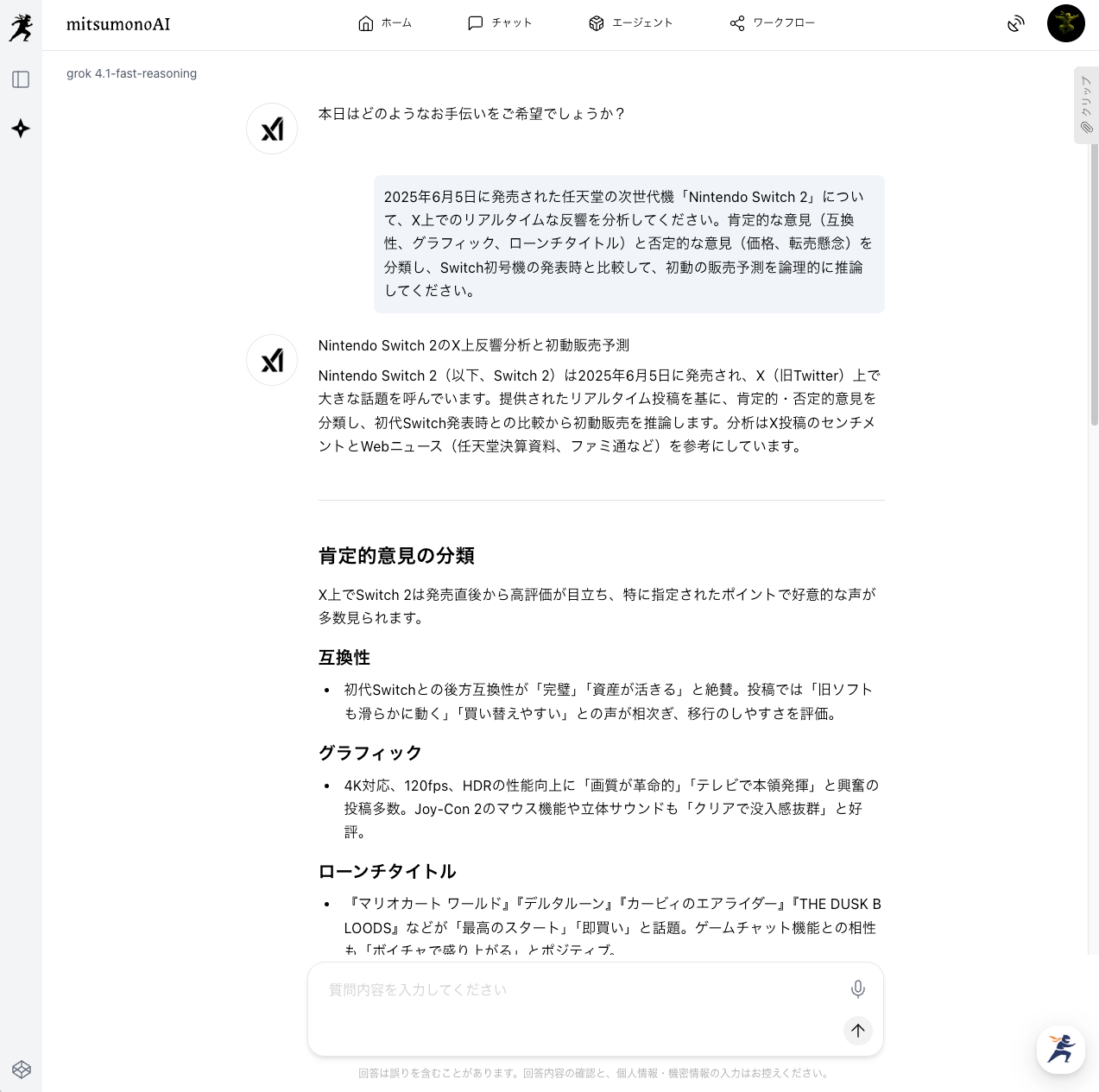 Grok 4.1-fast-reasoningは、X上の「転売への不満」といったリアルタイムな感情(センチメント)と、任天堂の決算資料における「1,036万台」という具体的な販売実績データを巧みに統合しました。