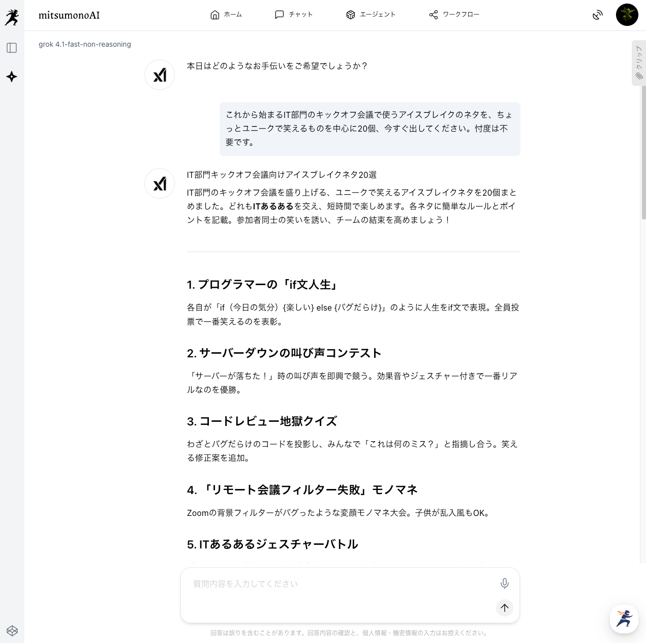 指示を出してからわずかな時間で20個のリストが表示される圧倒的な速度は圧巻です。「サーバーダウンの叫び声コンテスト」や「ブルースクリーン・ダンス」といった、ITエンジニアなら思わず吹き出してしまうウィットに富んだ「あるあるネタ」が即座に提案されました。一般的なAIの模範的な回答とは一線を画す、Grok特有のユーモアと瞬発力が、場の空気を変えるための強力なツールになることを証明しています。