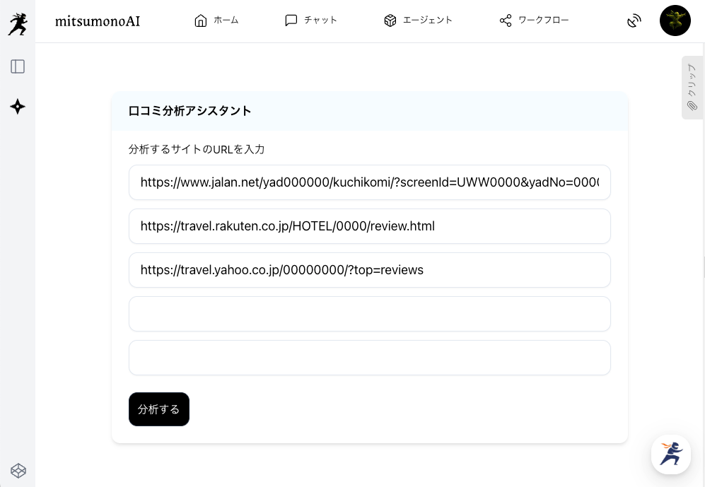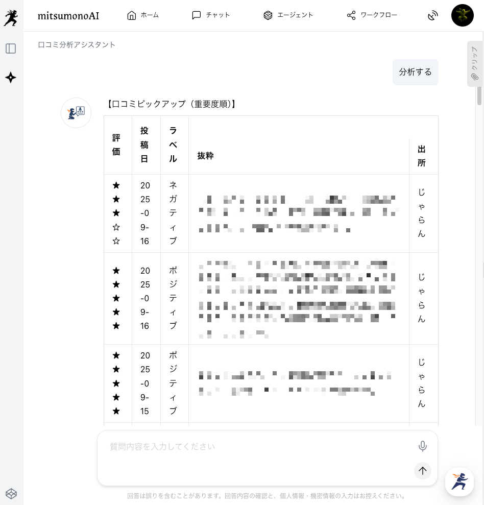 オンラインレビューサイトの口コミページURLをピックアップして、所定の欄に入力します。「分析する」をクリックすると、自動的に口コミを分析し、重要度順の口コミピックアップや、星評価の傾向、主要な論点などが出力されます。