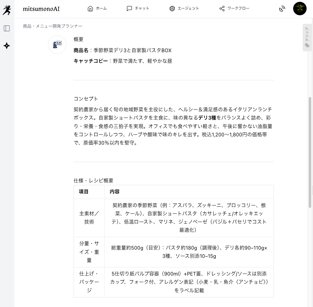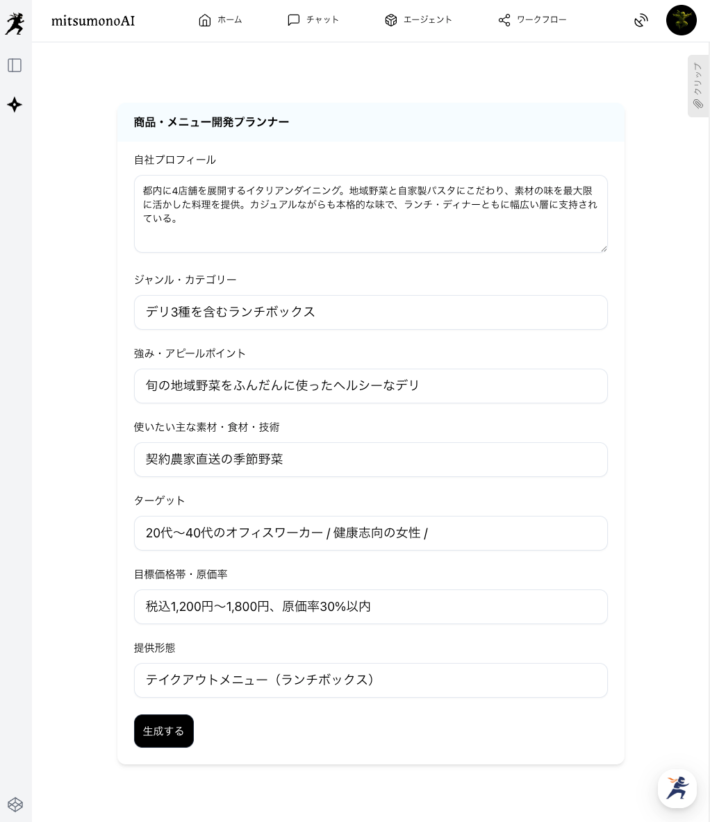 次に、「商品・メニュー開発プランナー」に、ステップ1で決定したメニュー(ランチデリボックス)に関する情報を入力し、「生成する」をクリックして回答を出力します。