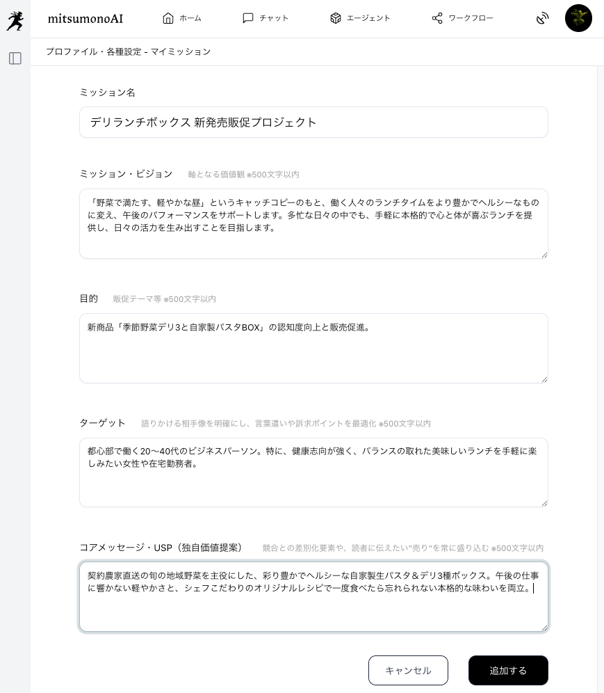 決定した新しいテイクアウトメニュー「ランチデリボックス(パスタ+デリ3種)」の販促活動を行うためのミッションを登録します。このミッションは、次のステップでSNS運用戦略を策定する際の軸となります。