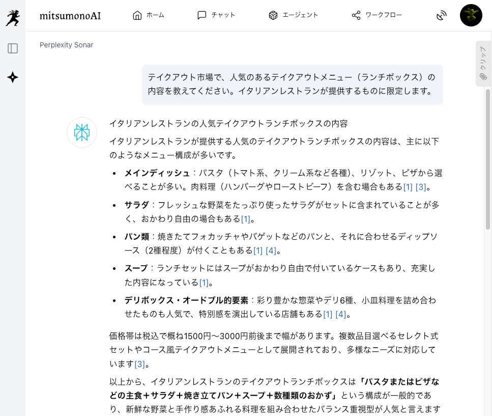 まず、最新のテイクアウト市場の動向と、消費者が求めるメニュー内容について調査します。今回はAI検索エンジンである「Perplexity Sonar」で情報収集を効率化します。