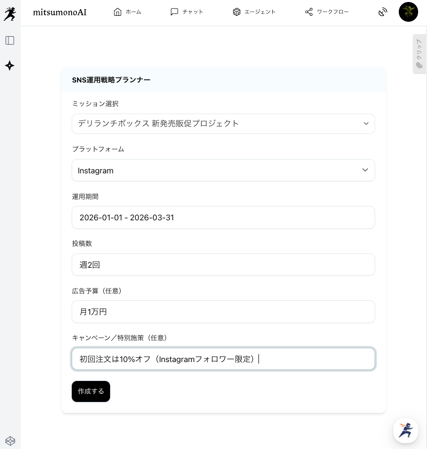 ステップ3で登録したミッションをもとに、「SNS運用戦略プランナー」を活用し、新商品の効果的なプロモーション戦略を策定します。