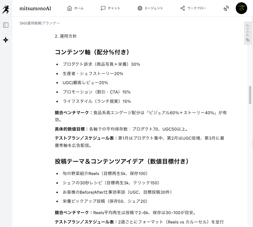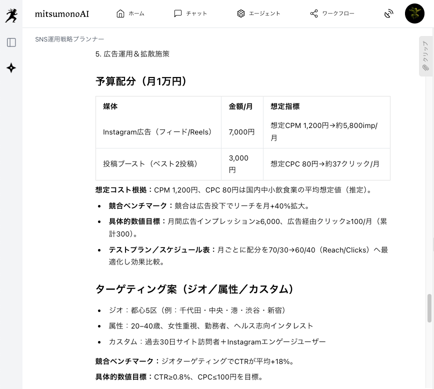 入力内容に基づき、運用方針、コンテンツのアイデア、投稿スケジュールなどが一括して出力されます。広告予算の配分や、広告でのターゲティングに関する情報も含まれます。