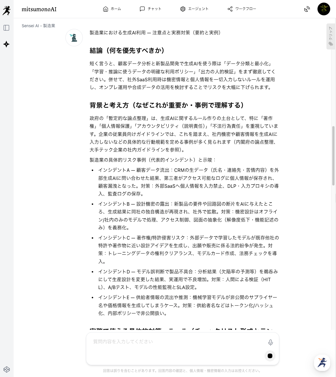 このステップにより、AIは業界特有の潜在的なリスク(例:設計図の意図しない漏洩、顧客データの誤った利用など)を洗い出し、それらを防ぐための具体的な入力ルールや、生成物の確認プロセス、責任の所在といった詳細な利用基準を明確化します。