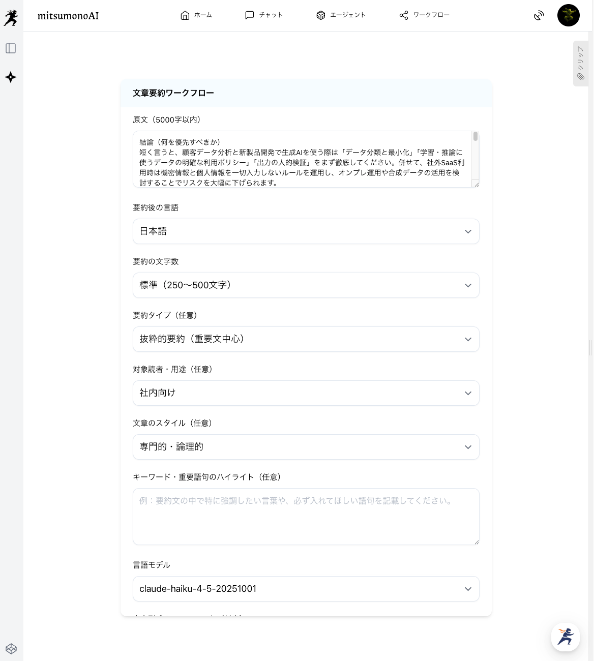 文章要約ワークフローを起動し、ステップ2で具体化した利用基準や注意点を入力し、簡潔で分かりやすいガイドライン文書のドラフトを作成します。