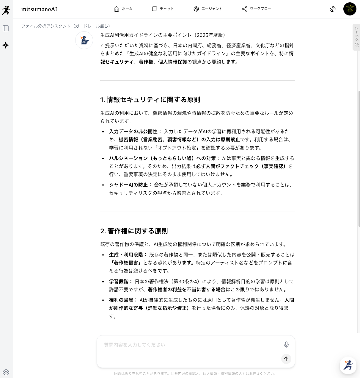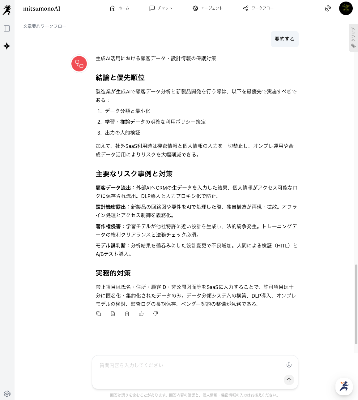 ファイル分析アシスタントが、国内外の膨大なAI関連ガイドラインや法規制(経済産業省、総務省、海外のAI規制動向など)を瞬時に分析。その要点を文章要約ワークフローで効率的に把握し、社内基準策定の土台を迅速に構築します。 - 自社特有のリスクと注意点の洗い出し: