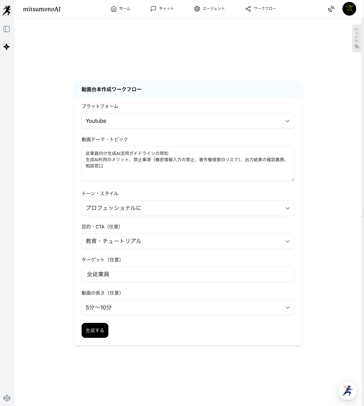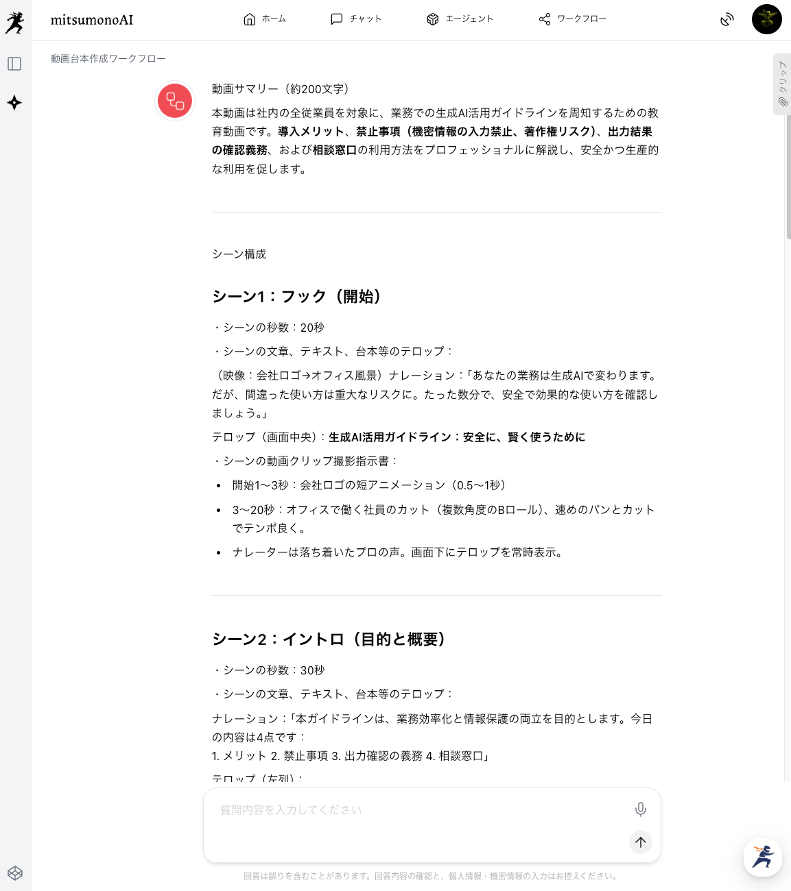 さらに、動画台本作成ワークフローを起動し、作成したガイドラインの内容を基に教育用動画のスクリプトを生成します。