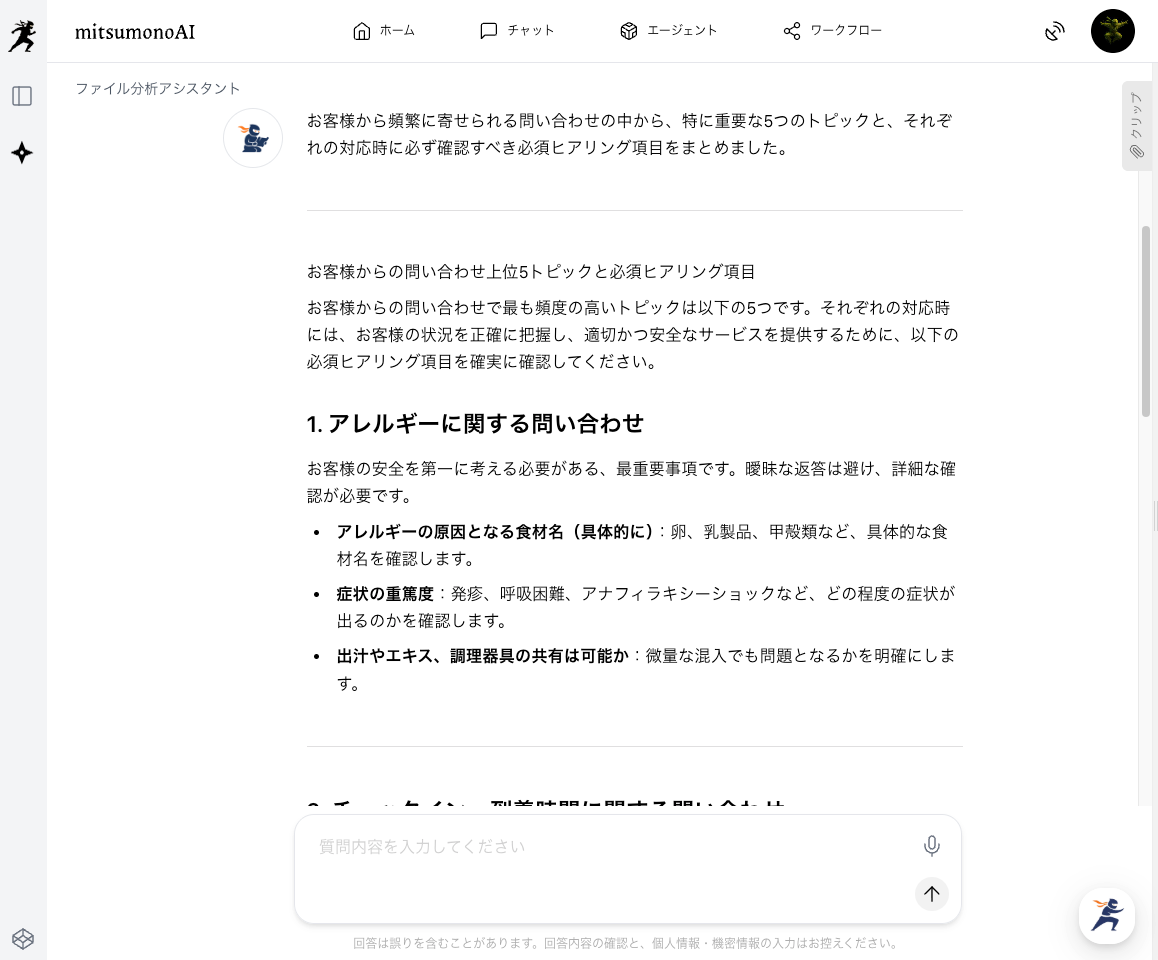 「アップロードしたファイルから、お客様からの問い合わせで最も頻度の高いトピックを5つ挙げ、それぞれにおいて必ず確認すべき必須ヒアリング項目をリストアップしてください。」