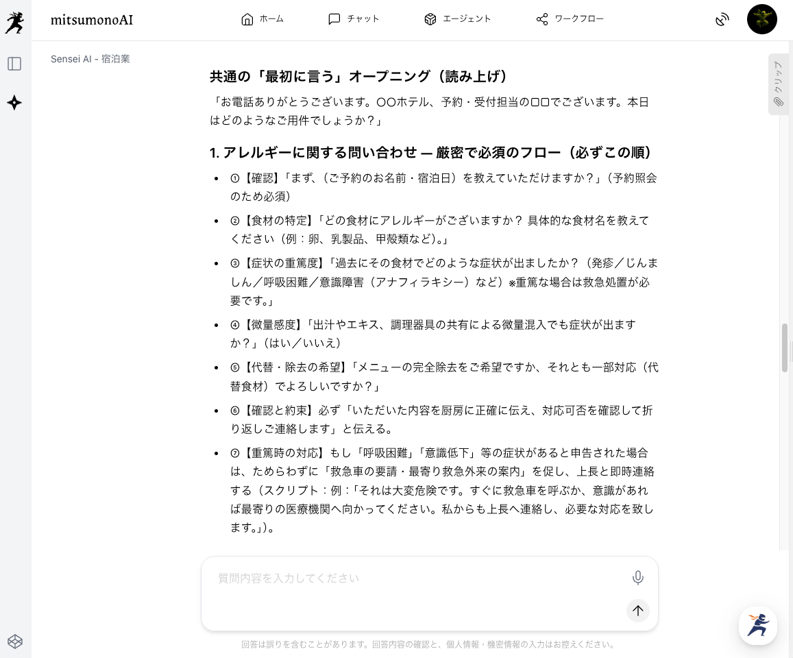 次に、その分析結果をSensei AI - 宿泊業に入力し、具体的なトークスクリプトを作成させます。