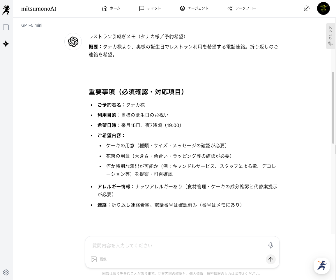 電話応対後、新人が聞き取った内容のメモをAIチャットに入力し、先輩社員が一目で状況を理解できる「エスカレーション・サマリー」を瞬時に作成させます。