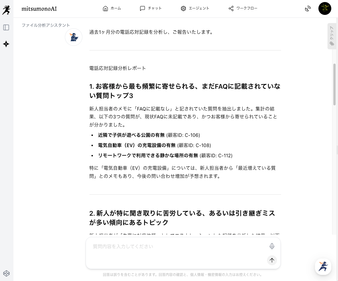 蓄積された対応記録(テキストファイルやCSV)をファイル分析アシスタントにアップロードします。
