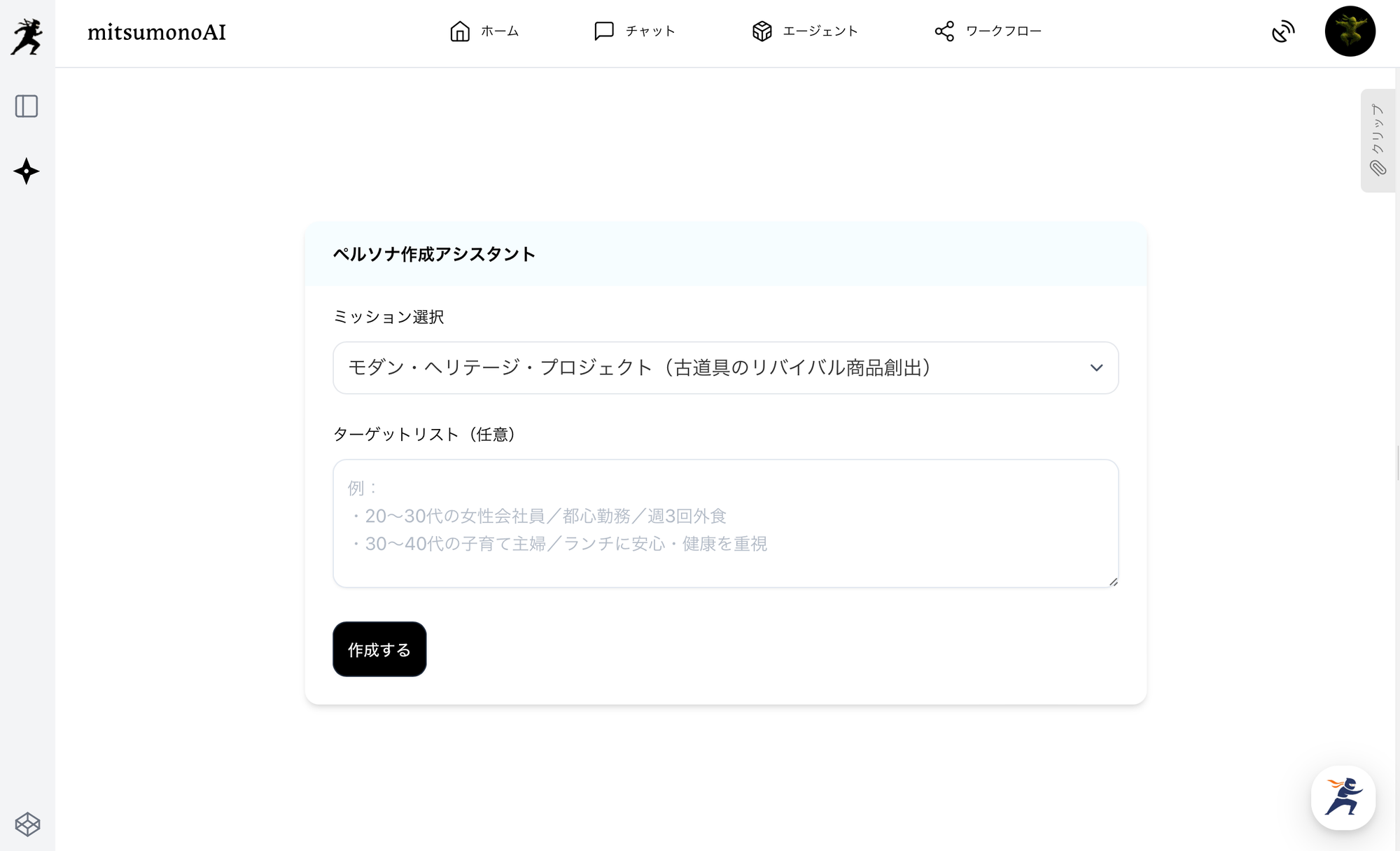 ステップ1で登録したミッションを選択して「作成する」をクリックすると、AIが複数のペルソナ候補を生成します。