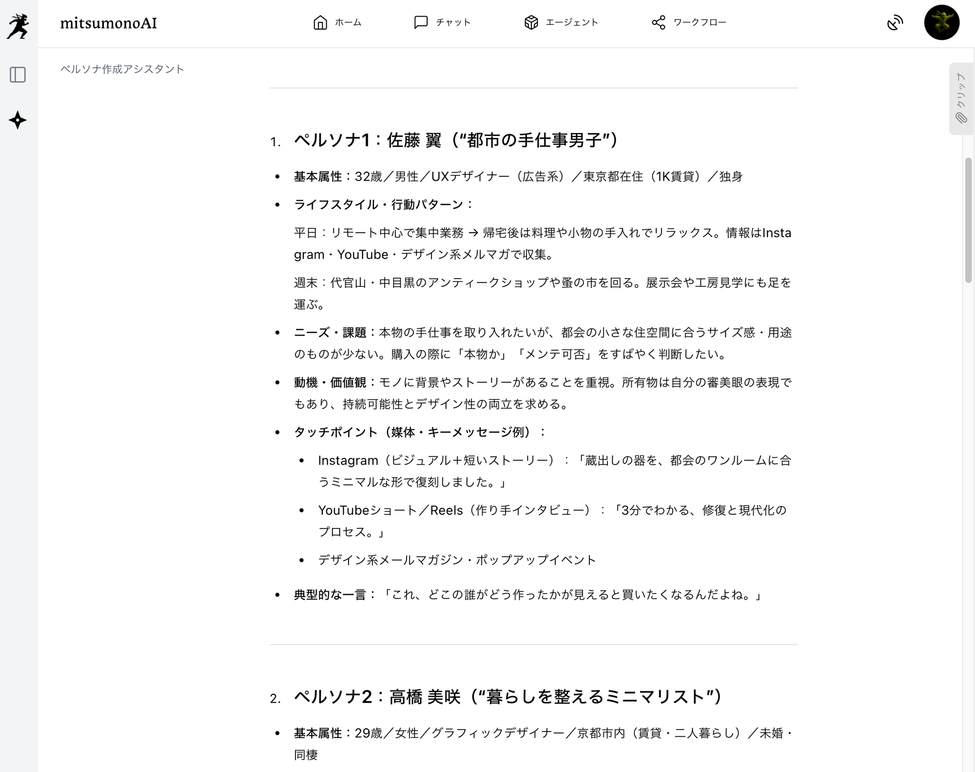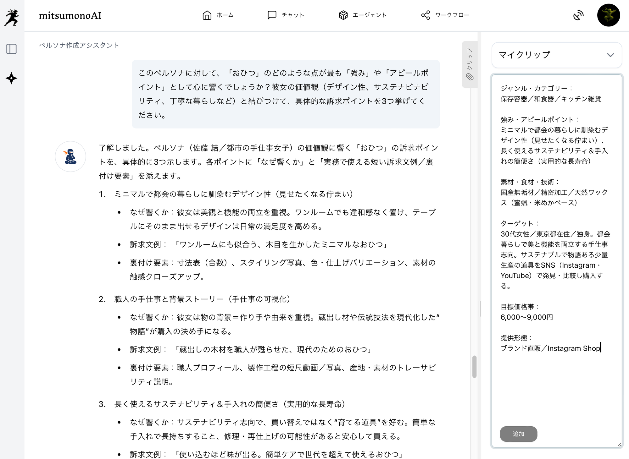 次に、mitsumonoAIの「ペルソナ作成アシスタント」を使い、伝統的な道具の価値を理解し、新しい形で活かしてくれる現代の顧客像を描き出します。