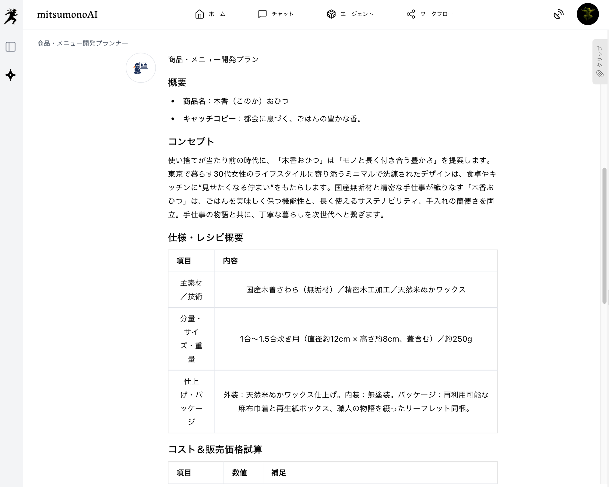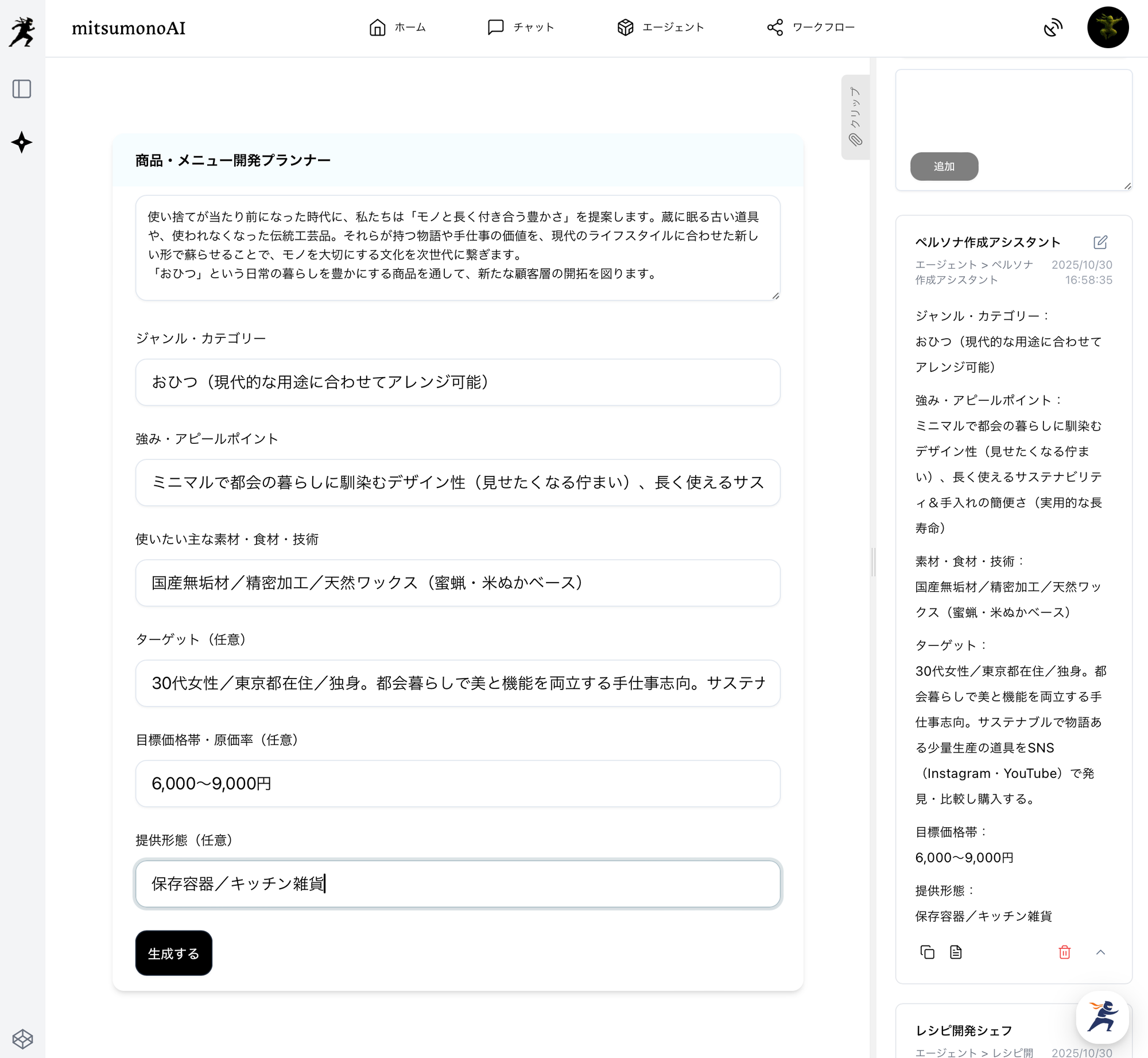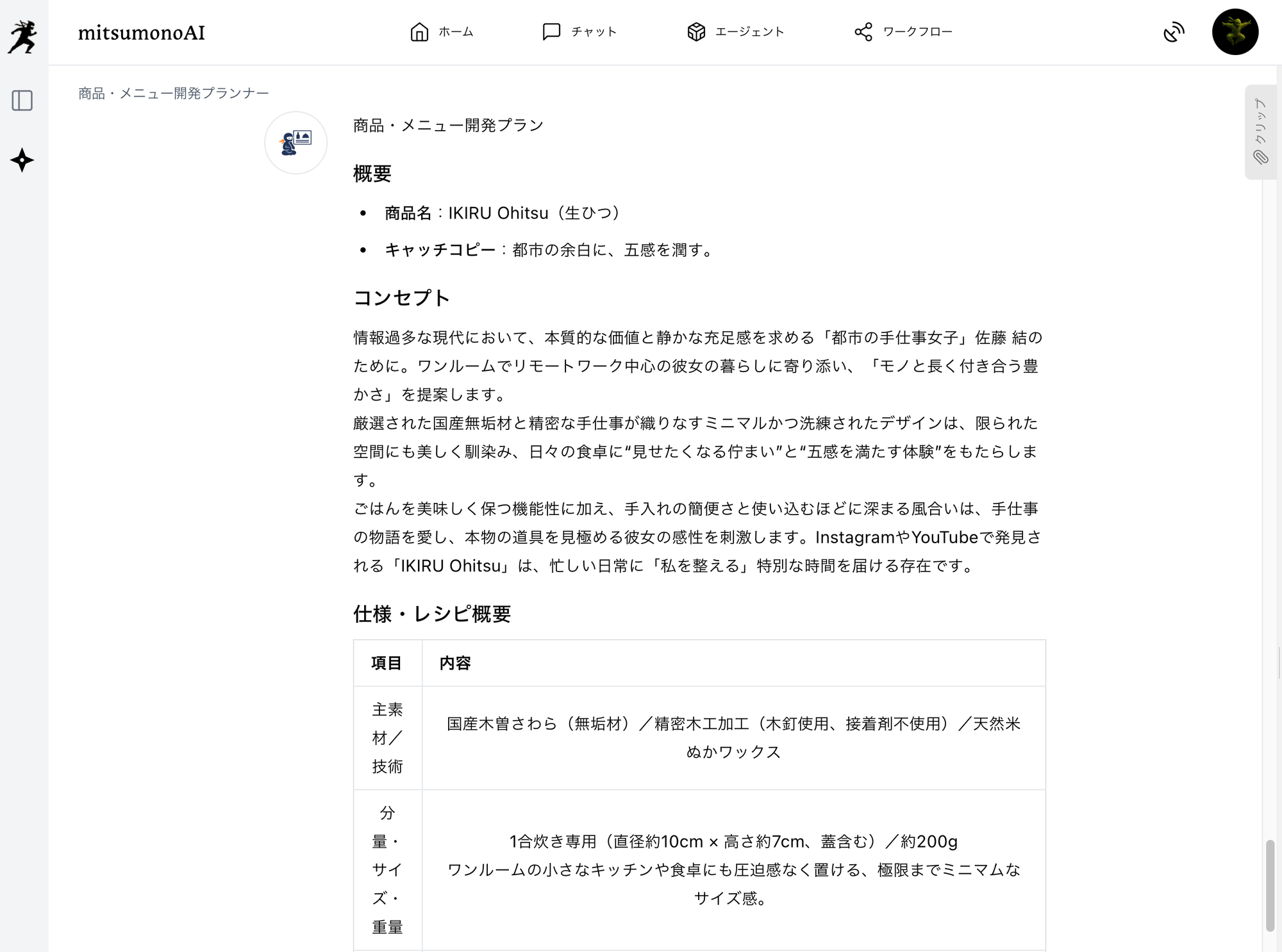 最後に、mitsumonoAIの「商品・メニュー開発プランナー」を起動し、ステップ2~3で得られた情報を基に、具体的なリバイバル商品を企画させます。