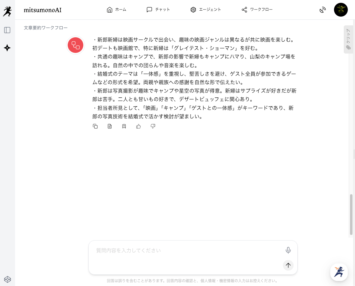 文章要約ワークフローによって、雑談を含んだ長い会話の中から、お二人の価値観を示すキーワードが明確に言語化・整理されます。