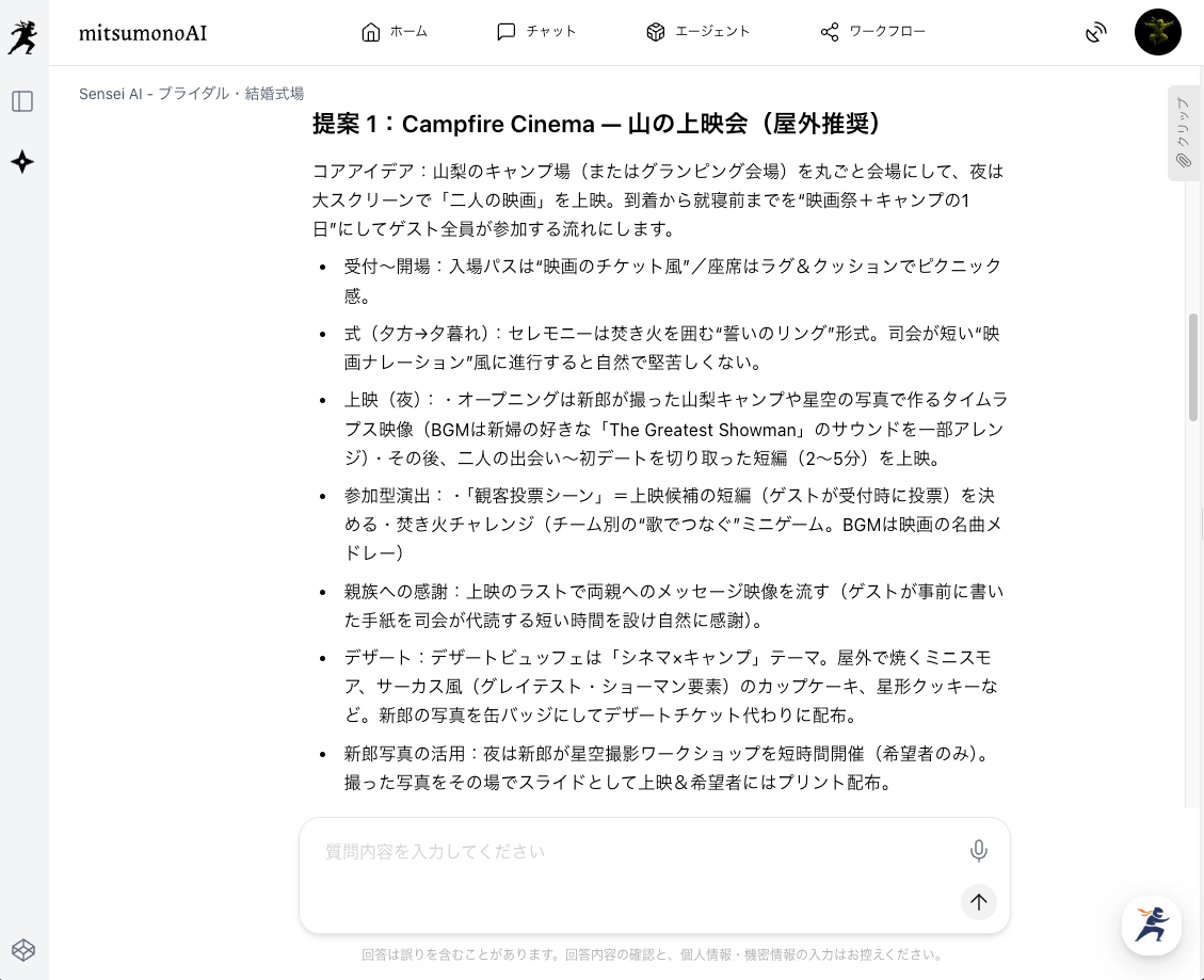 次に、ステップ1で抽出・整理されたキーワードのテキストを基に、ブライダル業界に特化した『Sensei AI - ブライダル・結婚式場』を使って、具体的なコンセプト案を作成します。