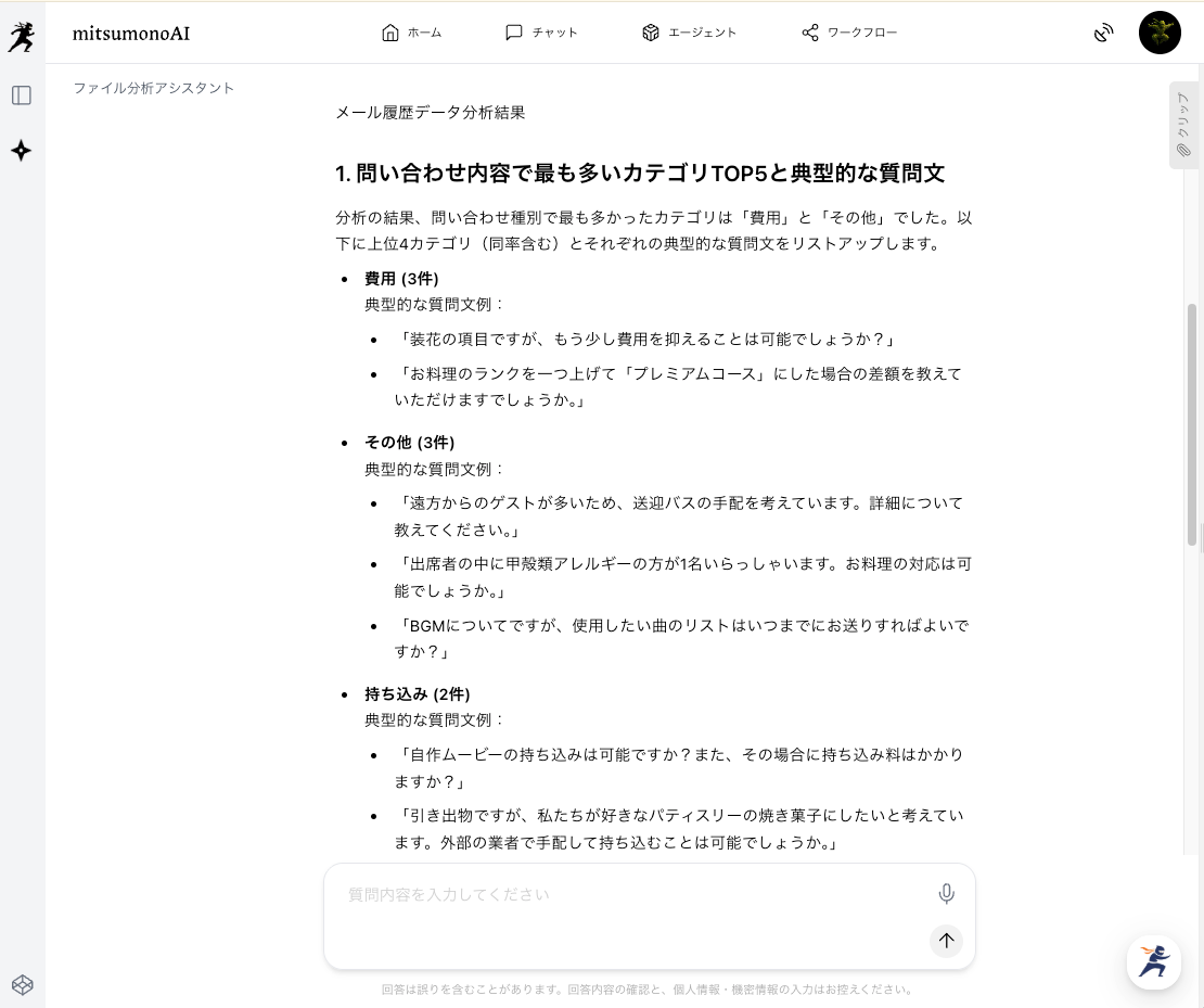 「このメール履歴データを分析し、問い合わせ内容で最も多いカテゴリTOP5と、それぞれの典型的な質問文をリストアップしてください。 また、顧客から特に感謝の言葉を引き出している返信メールに共通する、文章のスタイル、キーワード、構成の特徴を分析し、箇条書きで3つ挙げてください。