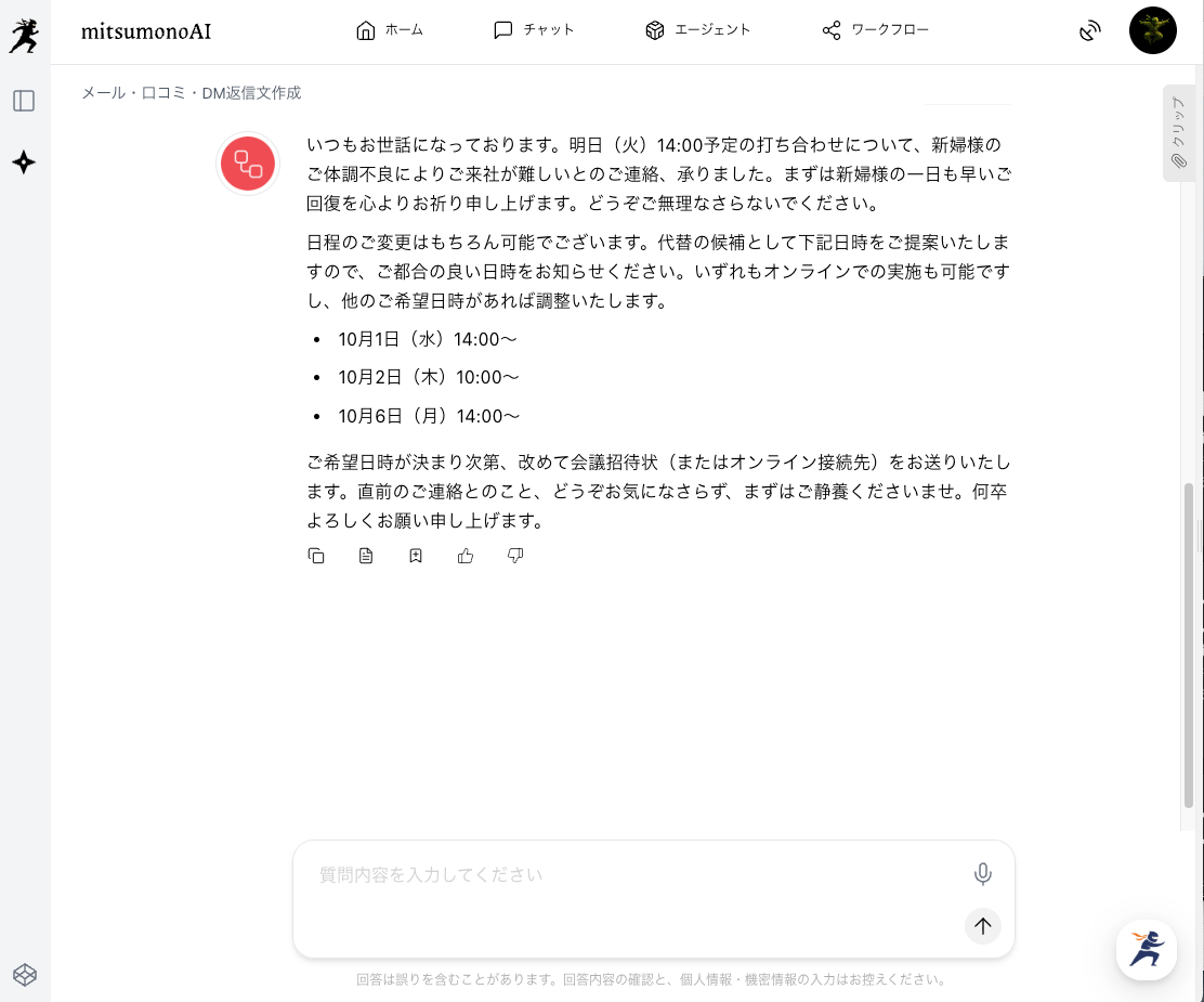 元のメッセージ内容 | 顧客から受け取ったメールの本文を そのままコピー&ペーストします。 | ご担当者様 いつもお世話になっております。 大変恐縮なのですが、明日火曜日の14時から予定しておりましたお打ち合わせについて、体調がすぐれずでお伺いすることが難しくなってしまいました。 もし可能でしたら、別の日程で再度調整させていただけますでしょうか。 こちらの勝手で大変恐縮ですが、ご検討いただけますと幸いです。 |