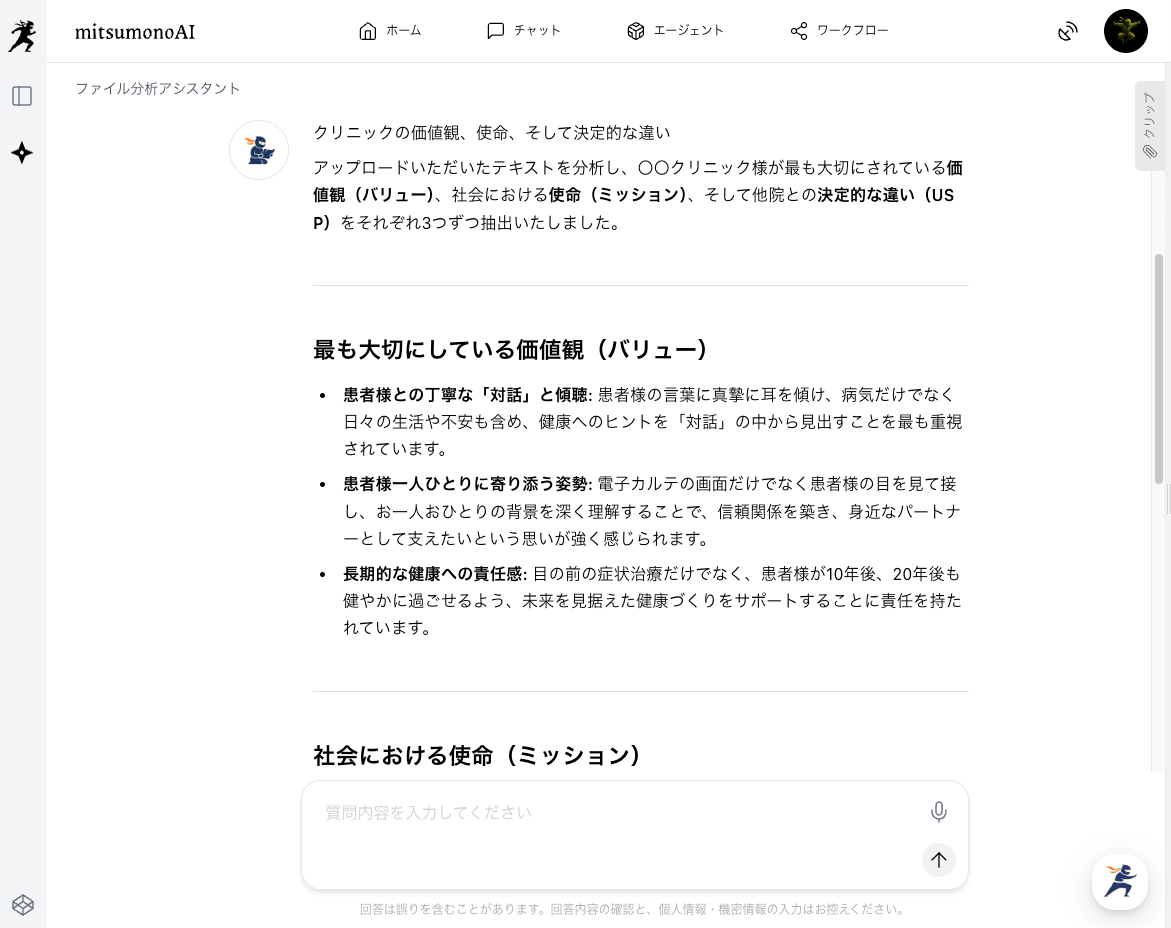 「アップロードしたテキストを分析し、当クリニックが最も大切にしている価値観(バリュー)、社会における使命(ミッション)、そして他院との決定的な違い(USP)をそれぞれ3つずつ、箇条書きで抽出してください。」