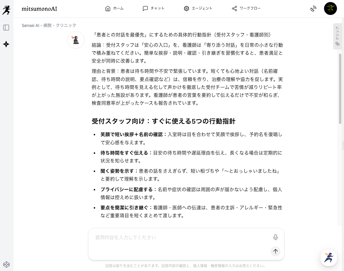 これらの生成結果を活用することで、「院長の想い」が、スタッフの日々の行動や、患者が目にするウェブサイトの言葉といった、具体的な形に落とし込まれていきます。