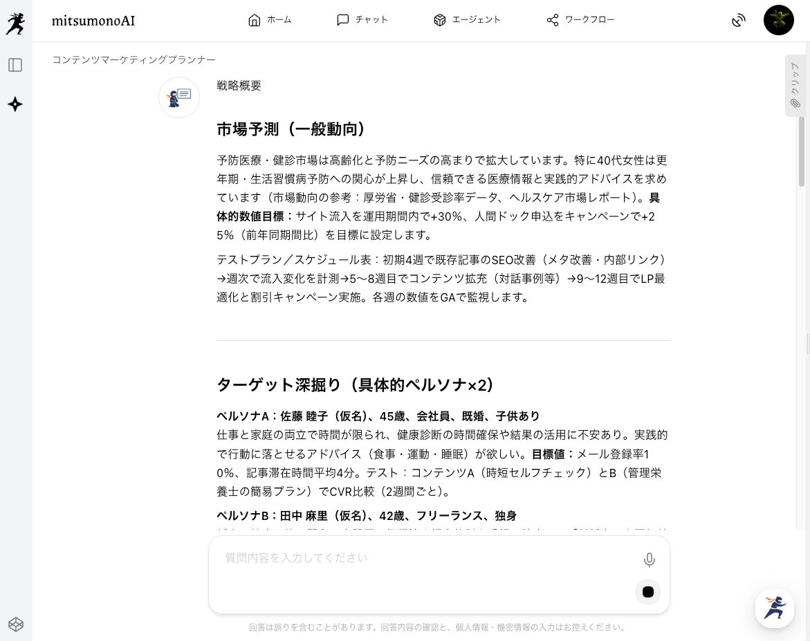 ミッションを選択し、大まかな運用計画を入力することで、AIが戦略に沿った詳細なコンテンツ案を生成します。