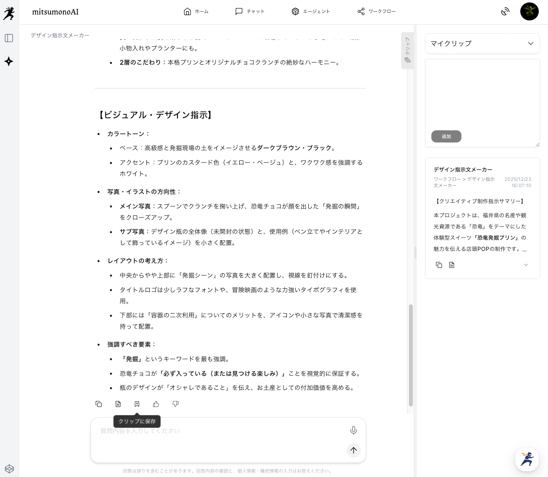 まずは、商品の写真と説明文を「デザイン指示文メーカー」に読み込ませます。AIが商品の特徴を捉え、お客様の目に留まるためのデザイン戦略(設計図)を作成してくれます。