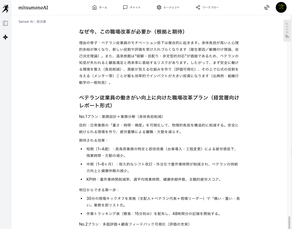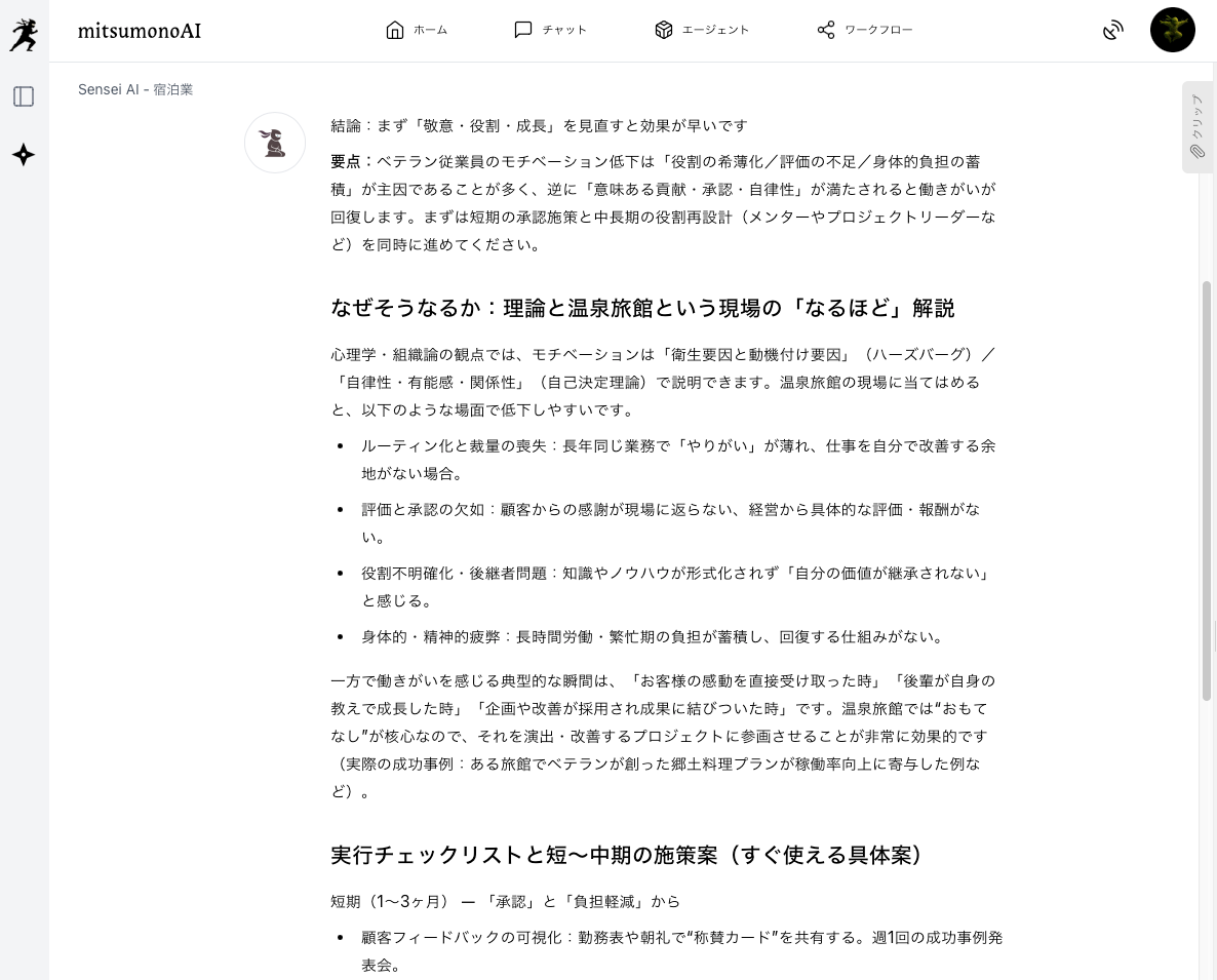 「Sensei AI - 宿泊業」を相談相手として、ベテランスタッフの「承認欲求」「自己成長」「貢献実感」を満たす具体的な職場改革プランを提案させるための方法を解説します。