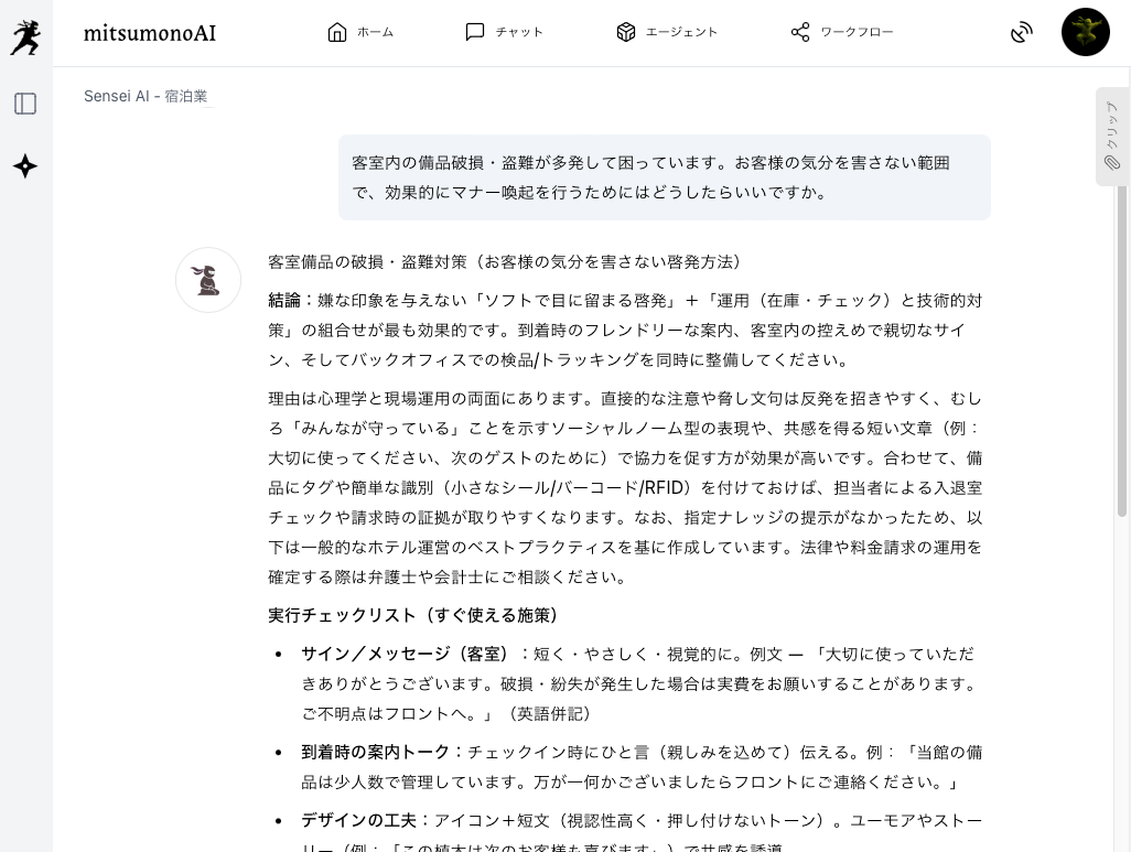 まず、宿泊業特化AIである「Sensei AI - 宿泊業」に、客室内の備品破損・盗難が多発している事実と、広報戦略について相談します。