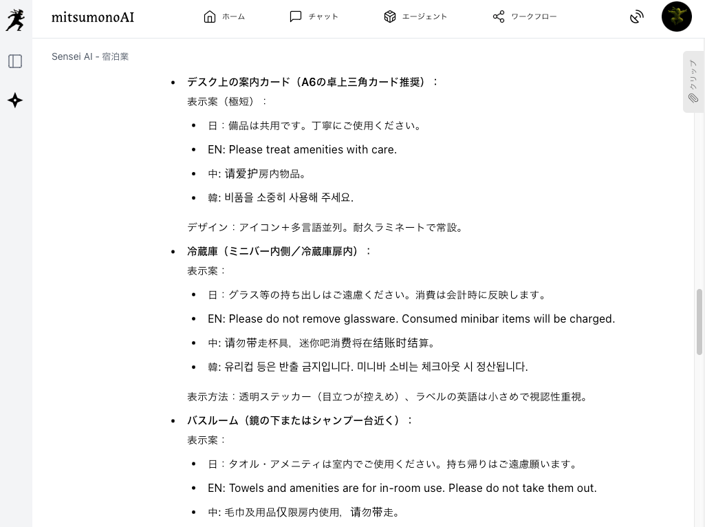 「お客様の気分を害さず、かつ抑止効果の高い案内文を、多言語で作成したい」というニーズについて、本記事では、「Sensei AI - 宿泊業」をリスクコミュニケーションの専門家として活用し、抑止効果と顧客体験維持を両立させる多言語案内を簡単に作成する方法を、具体的な手順とともに解説します。